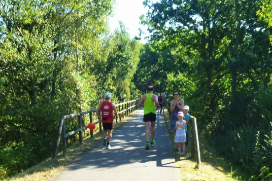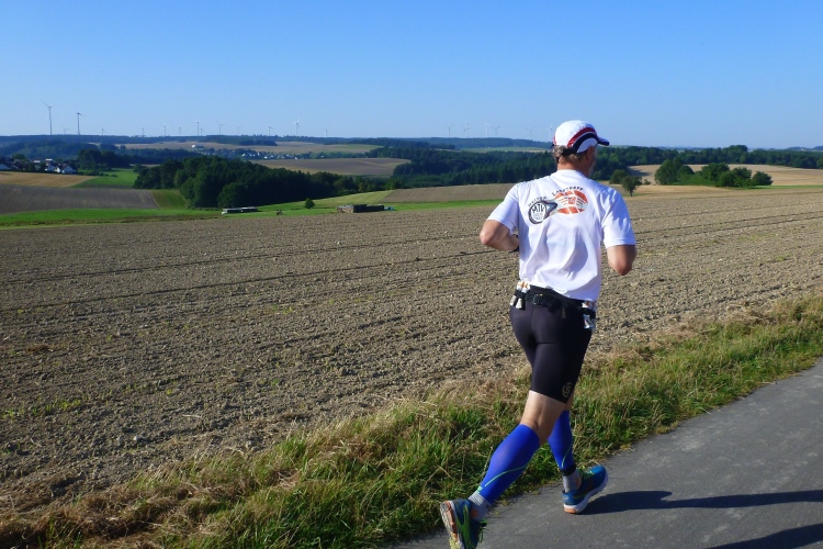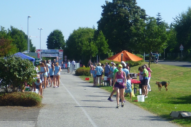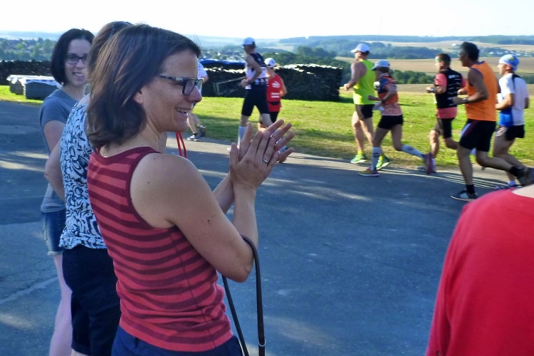 „Shut up and run“ seht auf dem Shirt von Eva, die heute in persönlicher Bestzeit Gesamtzweite bei den Damen werden wird. Ich versuche mich erst gar nicht daran zu halten. Wir spielen „Tuff Tuff Tuff Tuff Eisenbahn“. Die folgenden 9 Kilometer geht es durch wunderschöne Wälder. Von der oft höheren Warte unseres Bahndamms bieten sich wunderschöne Blicke auf die Felder. Hier wird wohl viel Getreide angebaut. Nebenbahntypisch kommen wir an vielen Weilern vorbei. Und überall warten Zuschauer auf uns und fast so oft gibt es Getränke- und Verpflegungsstellen. Ich habe den Eindruck, da will jedes Dorf dabei sein. Die Strecke wurde für uns Läufer von allen Autoabsperrpfosten befreit. Alle Querwege sind mit Gittern gesichert und oft von Helfern bewacht. Jede unebene Stelle im Teerband ist markiert. Da hat man keine Mühen gescheut, obwohl sich auch sonst niemand verlaufen könnte.