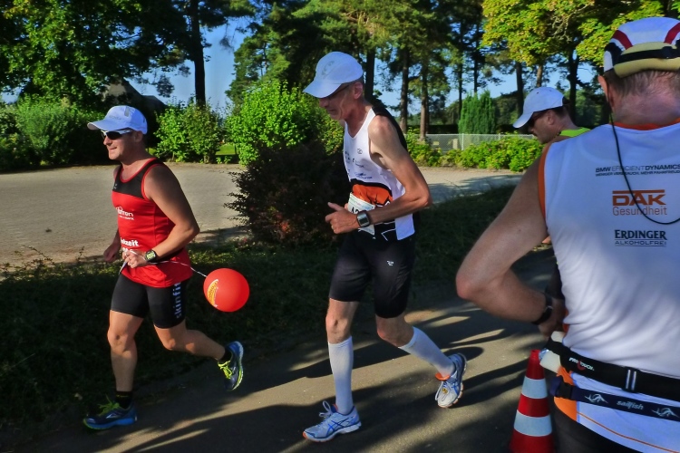 Staffeln sind auch unterwegs, so dass wir gelegentlich auf eine Wechselstelle treffen. Schon hier gibt es Duschgelegenheit aus Wasserschläuchen. Mein Thermometer zeigt 24 Grad auf den Waldpassagen. Da kann man nicht meckern: Es soll schon mal einen Lauf gegeben haben, bei dem die 40-Grad-Grenze nach oben durchbrochen wurde. Wir haben viel Spaß in unserem Grüppchen um Pacer Rudi.