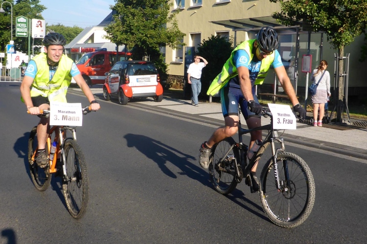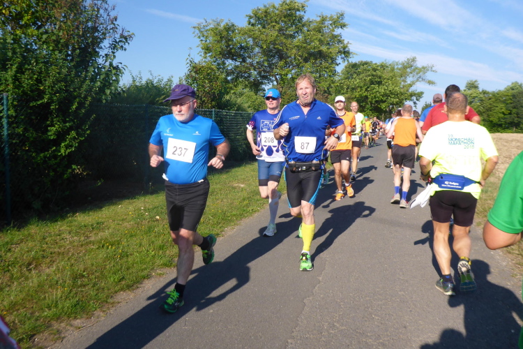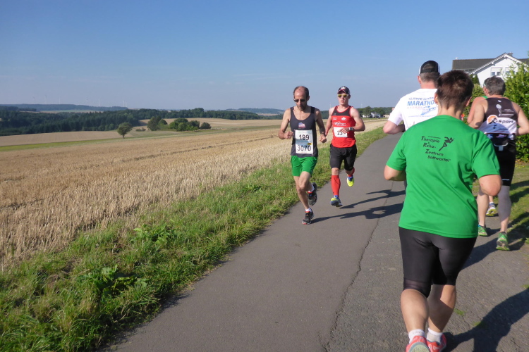 Zunächst folgen wir der Straße bergab, bis es am Stadion über einen Rasenstreifen auf einen Feldweg geht. Hier ist Konzentration gefragt, denn der Führungsradler kommt uns entgegen und hat alle Hände voll zu tun, um seinem Schützling den Weg zu bahnen. Marco Diehl ist in voller Fahrt. Schnell kommen aber auch seine Verfolger an uns vorbei. Wir amüsieren uns, weil sich einer der Schnellen aufregt, dass Marco scheinbar den Windschatten des Radlers nutzt. Nach der Wende am Friedhof wird mir klar, warum der Läufer so entzürnt war: Hier pfeift ein kräftiger Gegenwind.