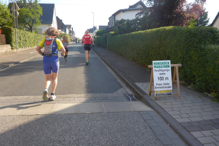 Kastellaun (km 27) kommt in Sicht, es wird wieder belebter. Von rechts stößt die Strecke des Halbmarathon auf unsere. Der Start war um 11 Uhr 30 und die Schnellen haben die Schleife von 6 km bereits beendet und biegen nun ein. Ich genieße den Durchlauf durch den Start mit den vielen Zuschauern. An der nun folgenden VP verkrümele ich mich allerdings hinter die Tische. Denn hier flitzen die Halbmarathonis nur so vorbei und schnappen etwas unkoordiniert nach den Bechern. Das ist mir zu chaotisch.