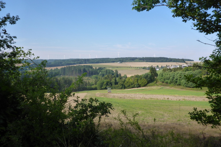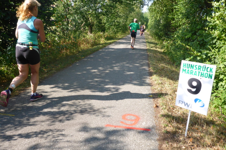 Der Weg, 3 Meter breit, asphaltiert und von Bäumen gesäumt, ist heute für Radler gesperrt, denn er gehört den Läufern. Hoch erfreut laufe ich am km 6 Schild vorbei. Das ist aber schnell gegangen. In Sabina hab ich eine nette Gesprächspartnerin gefunden. In gleichem Tempo bewegen wir uns im Gespräch vertieft vorwärts. Immer wieder öffnet sich die Allee und gibt den Blick auf die Weite der Hunsrück-Hochfläche frei. Wenn es auf dem Radweg irgendwelche Steigungen geben sollte, sind sie mir bisher nicht aufgefallen.
