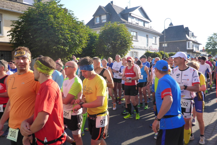 Langsam wird es nun auch für die Läufer Zeit. Das Gepäck wird abgegeben und man fiebert dem Start entgegen. Zunächst erfolgt aber noch eine Ehrung für 4 Läufer, die bei allen 15 Hunsrück Marathons dabei waren. Diverse Teilnehmer, die karitative Zwecke verfolgen, werden ebenfalls vorgestellt. Dann wird Marco Diehl interviewt, Hunsrück Marathon Seriensieger, der letztes Jahr leider verletzt aufgeben musste. Kurz vor dem Start muss dann auch Norbert noch ein paar Worte sagen: 100 Marathons sind doch etwas Besonderes. Dann pünktlich um 9 Uhr geht es los.