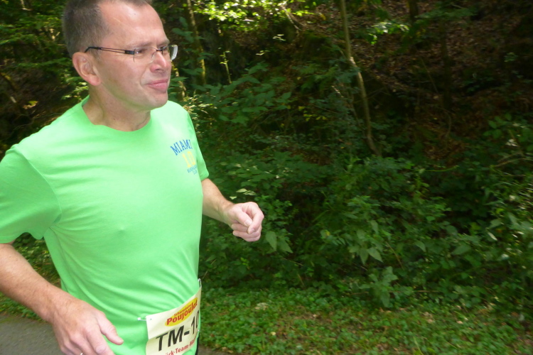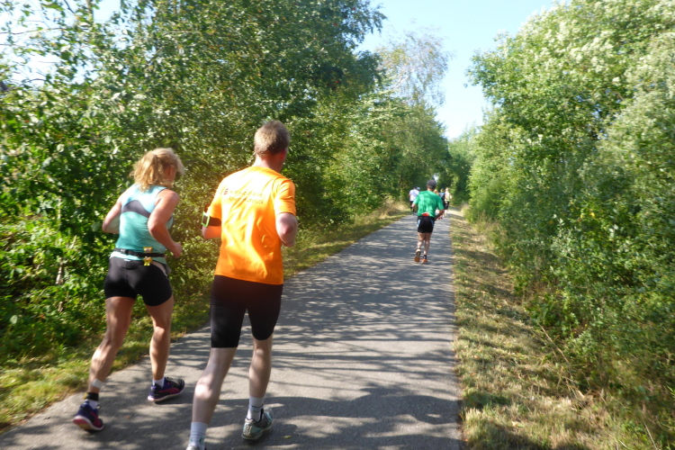 Bei km 10 warten die Helfer mit Wasser und Bananen. Das Wetter ist optimal, Temperaturen um die 20 Grad sind auf dem schattigen Weg gut auszuhalten. Hier ist auch der erste Wechselpunkt für die Staffeln. In dem Getümmel verliere ich Sabina aus den Augen. Auf meiner Uhr sehe ich eine super Laufzeit für die bisherige Strecke. Vielleicht wäre es ganz gut mich, nun einzubremsen.