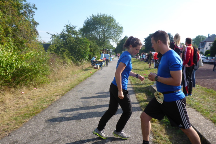 Wir verlassen das Begegnungsstück, gerade als der Führende des Staffelwettbewerbs dorthin einbiegt. Die Staffeln sind 5 Minuten später gestartet. Wir haben bereits 3 Kilometer geschafft und es geht links Richtung Zentrum von Emmelshausen durch das Wohngebiet bergauf. Die Steigung zieht sich und ich gehe lieber. Die Anwohner stehen auf der Straße und feuern uns an. Schon ist die erste Getränkestelle erreicht. Oben angekommen, stelle ich fest, dass wir wieder an unserem Ausgangspunkt gelandet sind. Ich erkenne trotz der vielen begeisterten Zuschauer den Kreisverkehr und das ZaP.