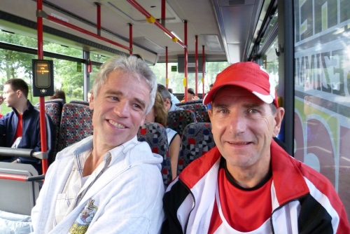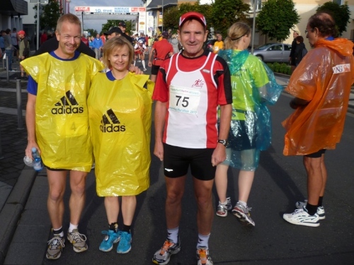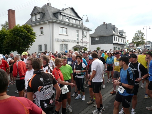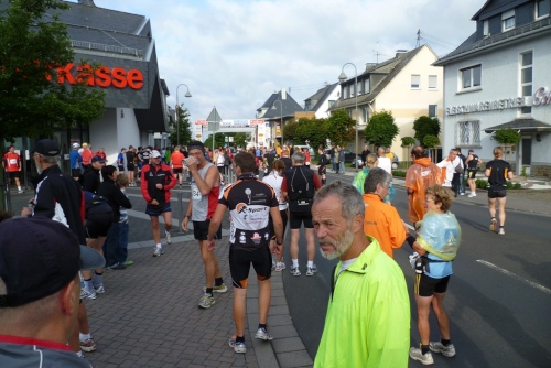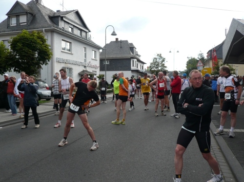 Um 7:55 Uhr startet der Bustransfer vom Ziel in Simmern zum Startplatz nach Emmelshausen. Es geht gemütlich so ca. 30 Minuten über die Hunsrücker Landstraßen. Nach Ankunft im Ortszentrum ist noch eine knappe halbe Stunde bis zum Marathonstart um 9 Uhr. Die Skater starten 15 Minuten vor uns, dann die Walker. Nach uns gehen dann noch die die Staffelläufer auf die Strecke.