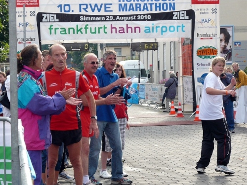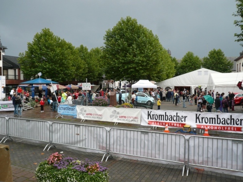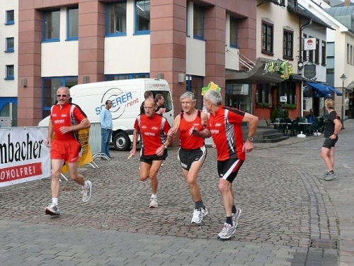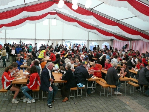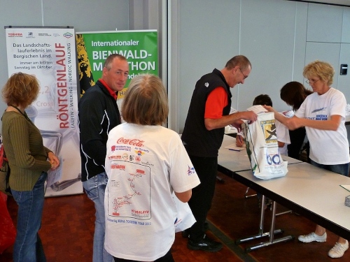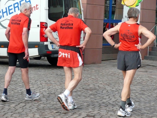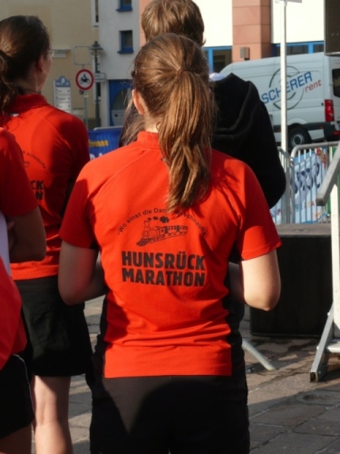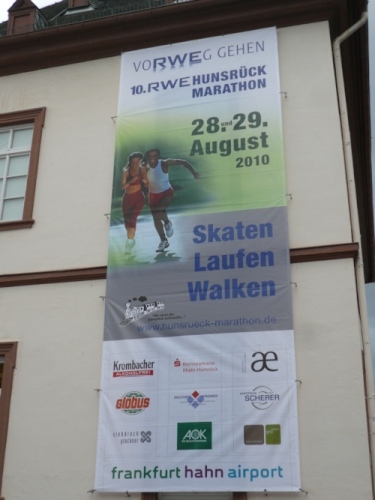 Nach einem Rundgang durch die Stadt kann ich in der Hunsrückhalle auf der kleinen Marathonmesse die Startunterlagen abholen. Das Startpaket von 33 – 46 €, je nach Anmeldung, umfasst: Bustransfer, Urkunde, Medaille und bei rechtzeitiger Anmeldung ein kostenloses Funktions-T-Shirt. Ab 16:30 Uhr gibt es die kostenlose Nudelparty im Festzelt auf dem Schlossplatz. Es ist schon bewundernswert, was hier Rosi und Ottmar Berg in 10 Jahren geschafft haben.