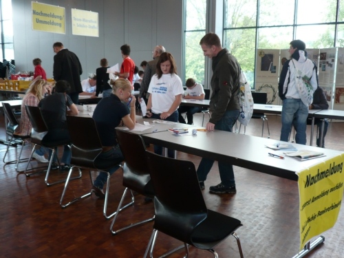 Wer aus der Nähe kommt, kann seine Startunterlagen ab 6 Uhr in der Hunsrückhalle oder am Startplatz in Emmelshausen abholen. Parkplatzprobleme gibt es heute Morgen nicht. Im Marathoncafè gab es ab 6 Uhr Frühstück, nicht nur für die, die (kostenlos) in der Sporthalle übernachtet haben.