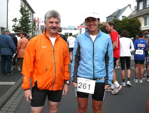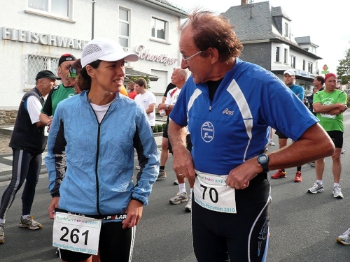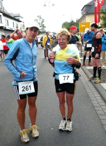 Da es noch recht kühl ist, versammeln sich die meisten Läufer noch im warmen in der Halle. Hier treffe ich auch Renate Werz, die gerade nach einem Werkzeug für ihren Schuh sucht. Auch Sabine Schneider, die fast jedes Wochenende in Sachen Marathon unterwegs ist, ist hier.