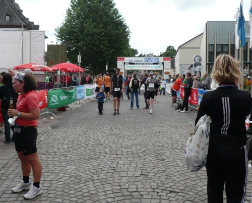 Hinter dem Tunnel geht es unter einer Brücke durch und danach rechts ab und als Überraschung aufwärts. Wir umlaufen einen Kreisel, wo uns die Polizei den Laufweg freihält. Nochmal kurz bergauf und dann liegt vor uns die 195m lange Zielgerade auf den Rathausplatz, wo richtige Volksfeststimmung herrscht. Viele Läufer werden von ihren Angehörigen auf den letzten Metern noch einmal angefeuert. Und so laufen Marathonis, Halbe und die Schülerstaffeln bunt gemischt ins Ziel.