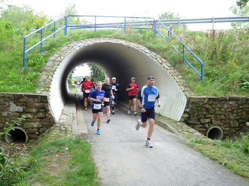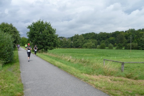 Die ehemalige Bahntrasse ist schön umgebaut worden zum Radweg und hat einen breiten und gut zu laufenden Asphaltbelag. Immer wieder kann man beruhigt in die Weiten des Hunsrück sehen und nicht nur auf den Laufuntergrund. Wir können, je nach Kondition, die letzten 10 Kilometer laufen und genießen.