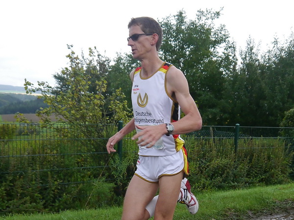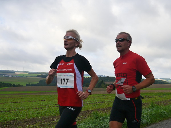 Um 9.00 Uhr starten die Marathonis zusammen mit den Staffelläufern und einigen Walkern. Die Runde durch den Ort ist etwas geändert und beinhaltet diesmal eine kurze Wendepunktpassage. Marco Diehl kommt uns als Erster entgegen. Sein Vorsprung ist nach ein paar Kilometern schon beträchtlich und er kann sicher sein, bei seiner siebten Teilnahme auch zum siebten Mal zu gewinnen. Es sind recht viele Zuschauer an der Strecke, die auf den ersten 5 Kilometern bis zum Schinderhannes-Radweg gleich einige Steigungen aufweist. Aber keine Angst, ich muss das erwähnen, eine Rolle spielen sie nicht. Insgesamt hat der Marathonkurs sogar 130 m Gefälle und viele Teilnehmer loben ihn als ausgesprochen schnell.
