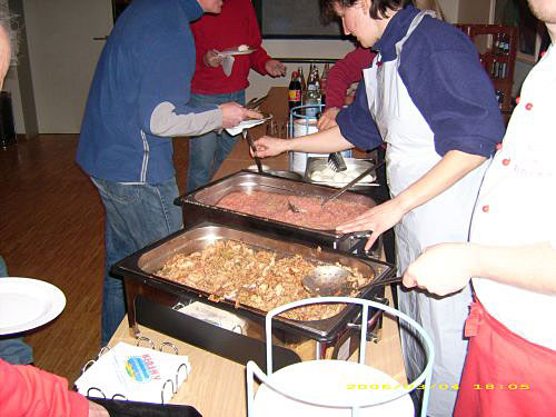 Insgesamt werden 119 Finisher gezählt, bei einem „normalen" Wintermarathon sind es doppelt so viele. Nach den heißen Duschen fahren wir zum Essen in das Theodor-Schäfer Bildungswerk. Wir kommen genau richtig und lösen unsere Bons ein. Zur Wahl stehen Labskaus und Reis mit Hühnerfleisch. Na dann Guten Appetit.