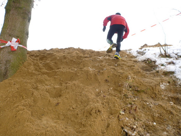 Der Startschuss erfolgt vom Laufwart des BLV Hans-Peter Schneider und das große Feld macht sich sprichwörtlich vom Acker, denn auf der Startrunde auf dem Fußballplatz fliegen schon Schnee- und Dreckbatzen durch die Luft. Nach 300 Meter wartet das erste Hindernis, die angesagte Böschung mit knapp fünf Höhenmeter. Maximal zwei, drei Athleten können da gleichzeitig hinauf. Damit es nicht zu leicht wird, hat man von oben eine Ladung lockeren Sand drauf gekippt. Mehr schlecht als recht komme ich hoch. Wegrutschend mit einem Schuh und den Ellenbogen eines Gegners in der Fresse bekommend schaffe ich es. Prost Mahlzeit!