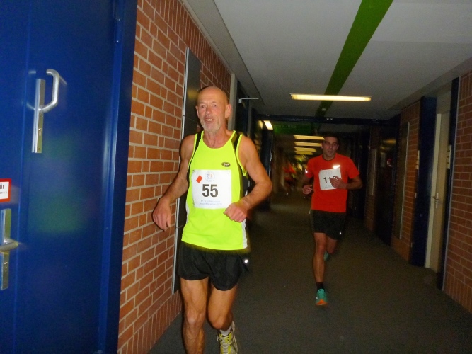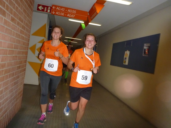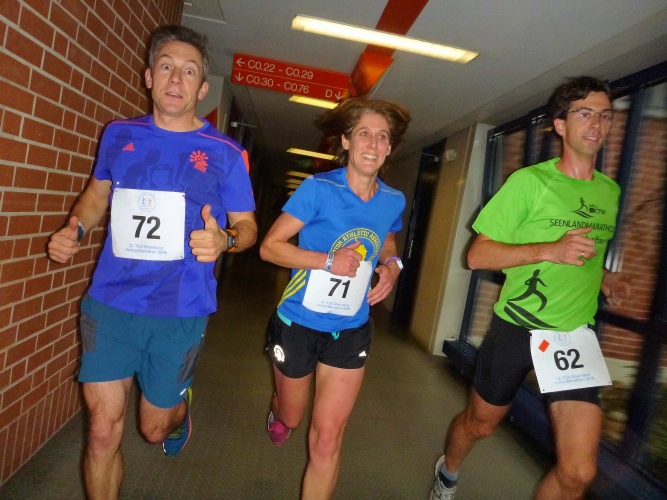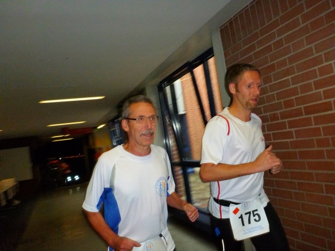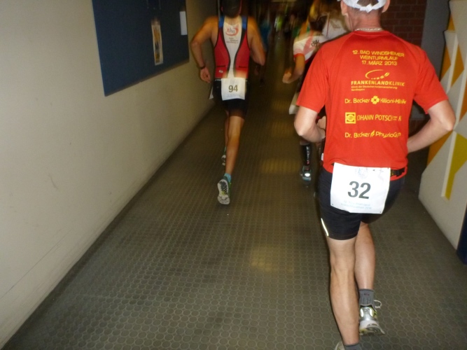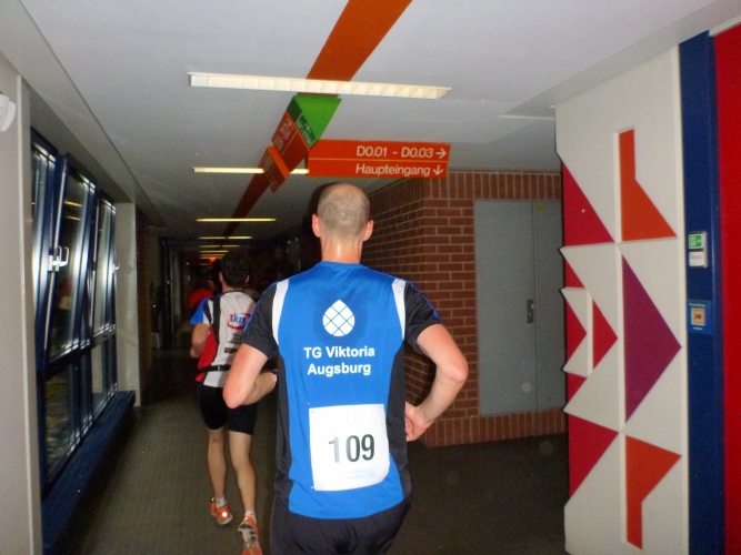 Nach rund zwei Stunden Laufzeit wird es ruhiger in den Gängen, die Halbmarathonis sind mit ihrem Tagwerk am Ende, sind beim Duschen, in der Kantine oder beim Zuschauen. Die schnellsten Einzel- und Staffelläufer ziehen weiterhin ihre Runden. Ich merke nach 30 Runden so langsam meine Beine, eine ungewohnte Belastung ist das mit dem vielen hinunter, hinauf, links und rechts. Dann werden die Schnellsten mit ihrem Lauf fertig und ich bekomme auf meinen Runden mit, dass sie im Foyer erwartet und angekündigt werden. Meine Restrundenzahl ist noch zweistellig, als der erste durch das Siegerband läuft.