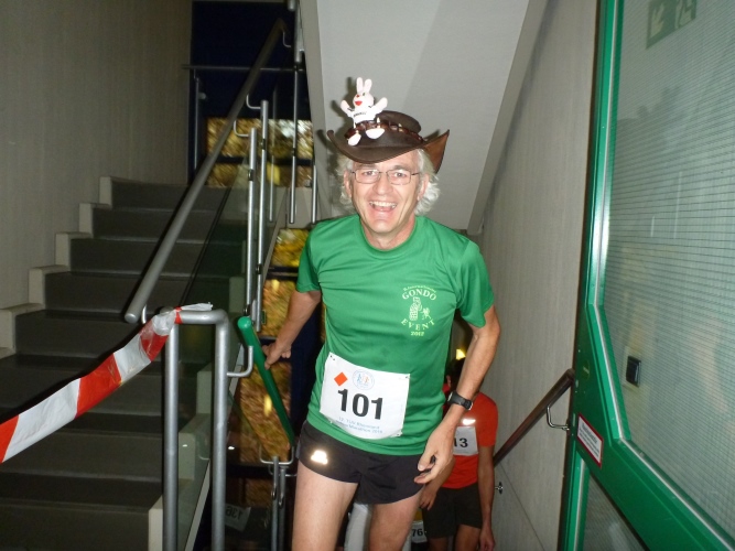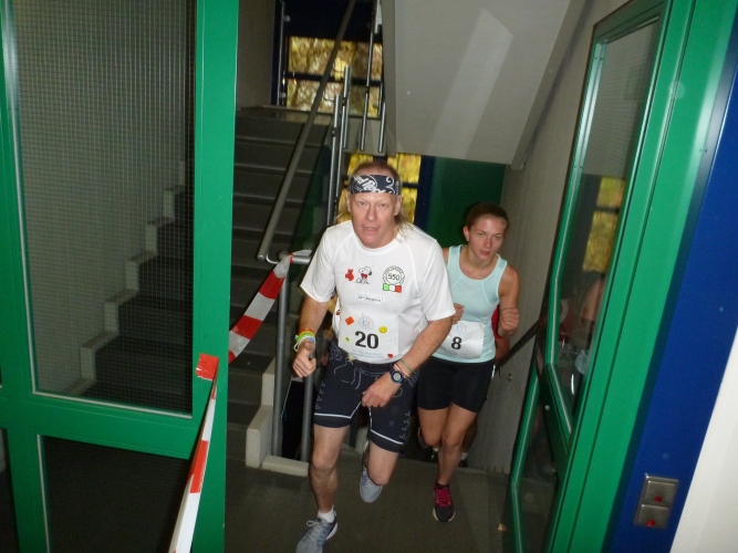 Jede Runde will ich euch nicht erzählen, das würde meine Birne nicht aushalten. Ich kann mich noch an meinen ersten Start hier erinnern, als mir gegen Ende des Rennens langweilig wurde. Ich habe versucht, die Anzahl der Treppen zu berechnen, musste aber jedes Mal wieder vor einem Treppenhaus mit der Multiplizieren aufhören und hatte unten das Zwischenergebnis vergessen. Mittlerweile weiß ich die Anzahl der Stufen „no“ und „nauf“ (hinunter, hinauf): 22 Stufen hinunter, die gleiche Anzahl hinauf. Das 55 Mal, macht insgesamt 2420 Stufen. Und eine starke Beinmuskulatur, garantiert.