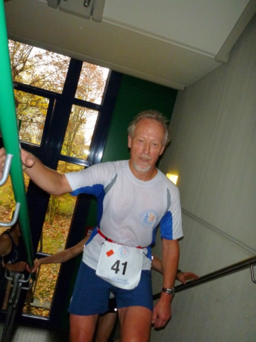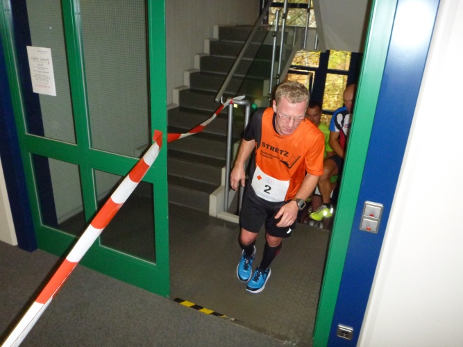 Langweilig ist so eine Veranstaltung auch nicht, auch wenn eine Vereinsangehörige mein Vorhaben mit der Bemerkung „du arme Sau“ kommentiert. Alleine schon die Treppenhäuser sind ein Erlebnis: hinunter muss ich vorsichtig laufen, bin im Vergleich zu meinen ersten Start unsicherer geworden. Außerdem ist in einem Treppenhaus das Geländer rechts angebracht, und an genau der Hand hängt die Kamera. Sollte ich den Abflug machen, könnte ich gleich die Qualität der Matratzen testen.