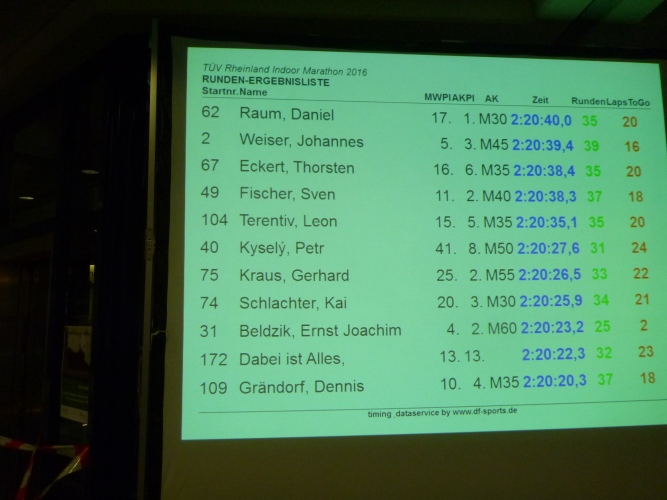 Die Rundenzählerei macht die EDV. Aber wie bekommt der Läufer mit, in welcher Runde er unterwegs ist oder wie viele er noch machen muss? Genial, ein paar Meter hinterhalb den Zeitmeßtoren wirft ein Beamer deine Rundenzahl an die Wand. Am Anfang sind aber so viele Läufer unterwegs, da braucht es ein bisschen Glück und ein scharfes Auge, damit du deine Runden sehen kannst. Später, wenn nur noch Marathonis unterwegs sind, wird es einfacher. Am Ende sollte man aber beim Zeitnehmer noch einmal nachfragen, bevor man die Arme hochreißt. Es ist schon mal vorgekommen, dass einzelnen Athleten eine Runde fehlte und sie nicht auf der Ergebnisliste auftauchten. Ärgerlich.