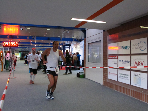 Später Nachmittag und 50 Runden beziehungsweise vier Stunden später. Draußen regnet es wieder. Die ersten Anzeichen für ein Läufer-Burn-out machen sich bei einigen bemerkbar. Meine Batterien sind leer, ich habe eine Energiekrise. Wie gerne möchte ich wieder Energiespitzenwerte erreichen, als nur wie eine menschliche Energiesparlampe herumzubummeln. Je anspruchsvoller die Tätigkeit, desto länger die Arbeitszeit. Ich male mir in den schwärzesten Farben aus, was passiert, wenn ich nicht weiterlaufe. Noch mehr Überstunden? Und was wird aus meinem dritten Platz? Schnell versuche ich im Kopf auszurechnen, wie viel fünf Runden in Kilometern sind. Aber in diesem Zustand auch noch rechnen? Es war mir die ganze Zeit egal, dann ist es jetzt auch egal. Komisch, hier rechnet man nicht in Kilometern sondern wirklich nur nach Runden und die „fliegen“ schneller vorbei, als die elenden Kilometerschilder.
