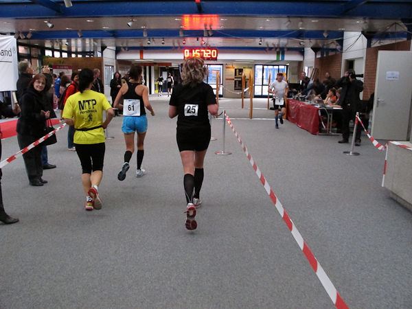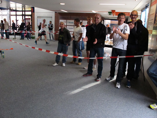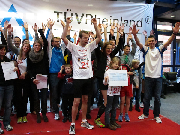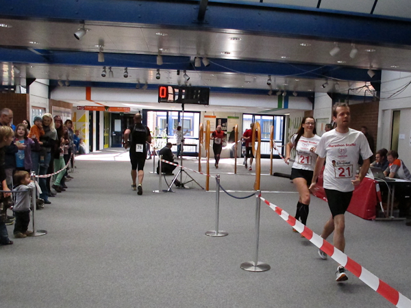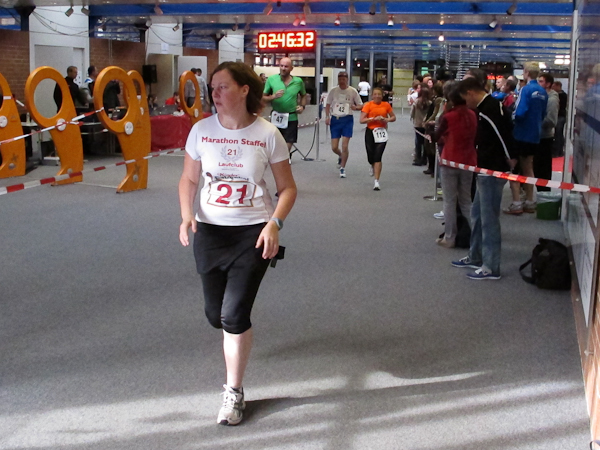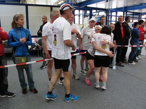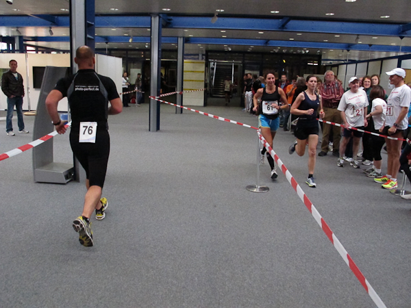 Ein (Lauf)Kollege ist ebenfalls im Ziel. Ich sehe nur, wie er wortlos zum Aufzug schlappt. Sorgen brauche ich mir um ihn nicht zu machen, denn es gibt einen Läuferbereich mit einer Chill-Out-Zone inklusive Massage, dazu Kaffee und Kuchen, was will Läuferherz mehr? Auch mein Gang ist träge. Nur noch zweiundzwanzig Treppenstufen und ein paar Schritte wären es bis zu den Duschen. Aber wer will schon duschen, wenn er gleich auf den roten Teppich darf und für diesen Lauf auch noch belohnt wird? Während die Siegerehrung im vollen Gange ist, ziehen noch immer Läufer ihre Runden. Einige Helfer beginnen damit, Stühle beiseite zu stellen, denn um 18:00 Uhr ist hier Schluss. Das Büro, das heute kein Büro sein will, schließt. Nun haben alle Läufer Feierabend. Sonntagsarbeit kann ganz schön anstrengend sein…