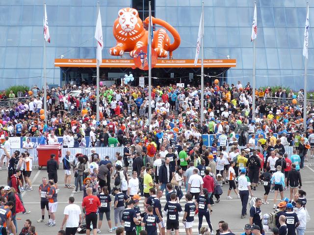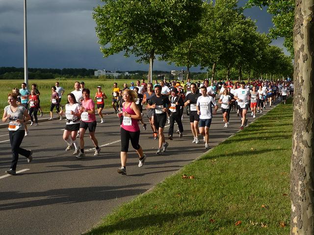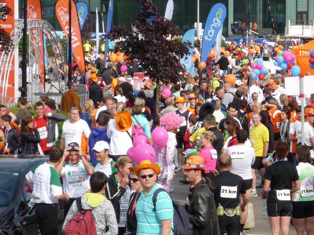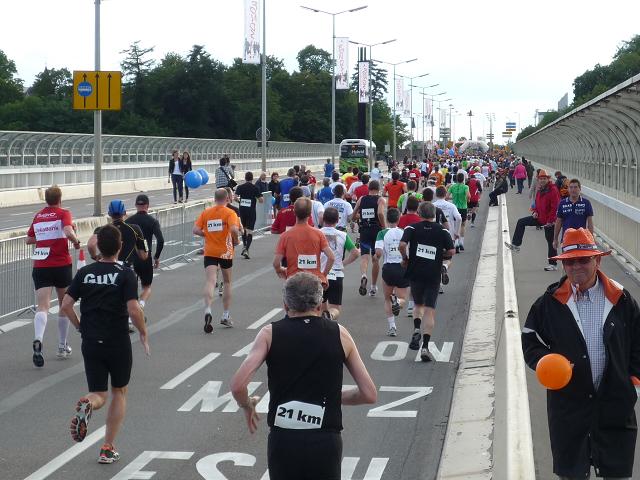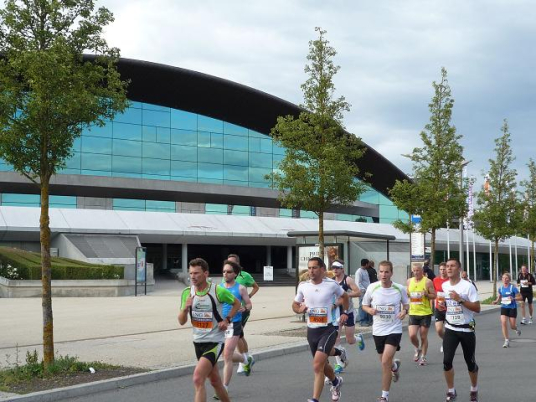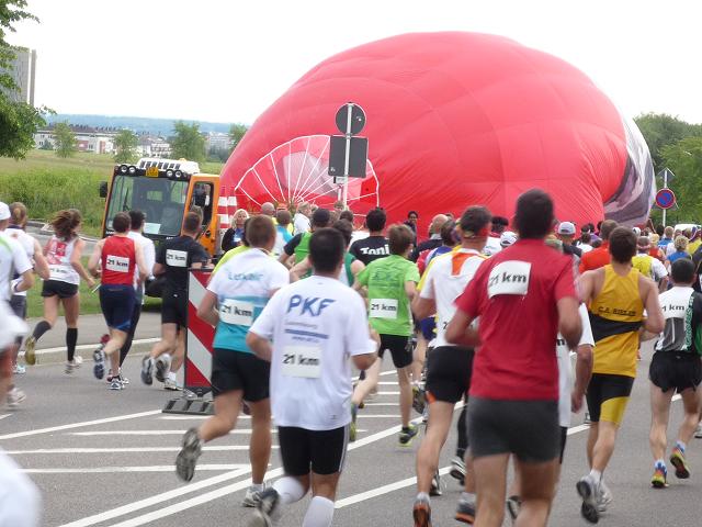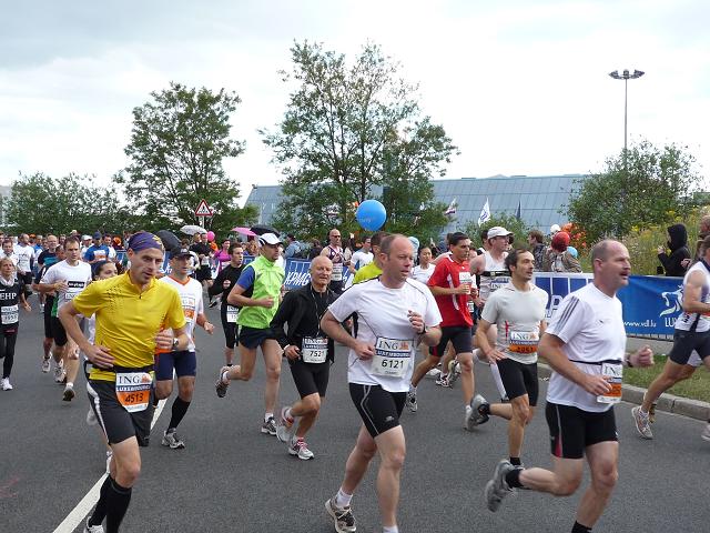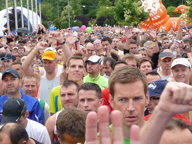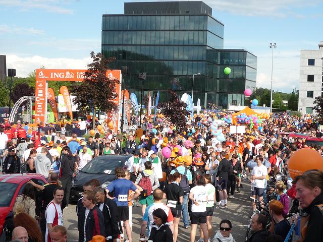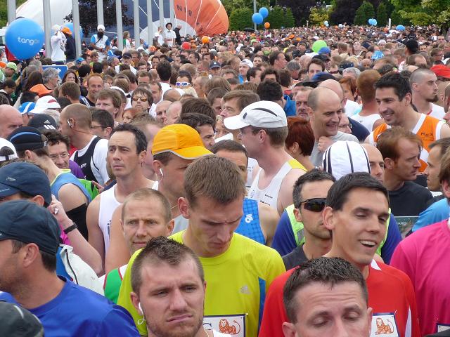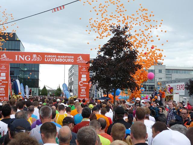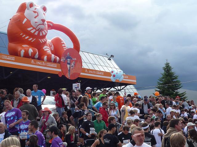 Nach dem Auflauf in den Hallen bietet das Parkplatzgelände vor der Luxexpo umso mehr Bewegungsfreiheit. Hier ist der Startkanal eingerichtet. Ein beeindruckendes Bild bietet sich, als sich um die 5.000 Halbmarathonis, etwa 1.500 Marathonläufer und die Startläufer der 400 Marathon-4er-Staffelteams, dazu noch ein beachtlicher Tross an Begleitern zum gemeinsamen Start auf der Starttrasse sammeln. Dicke Wolken am Himmel verheißen nichts Gutes und entladen wie zur Vorwarnung schon einmal ein paar dicke Tropfen. Aber wir haben Glück: Mehr wird es nicht werden, dem nur wenige Kilometer entfernt niedergehenden Duscher entgehen wir. Vielmehr sorgt ein angenehm kühlendes Lüftlein für ideale Laufverhältnisse.