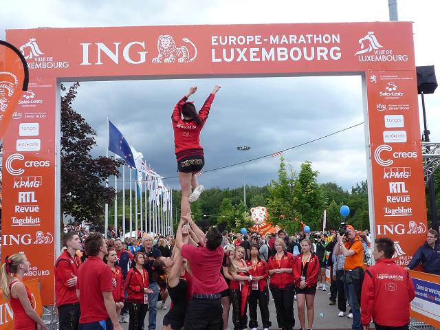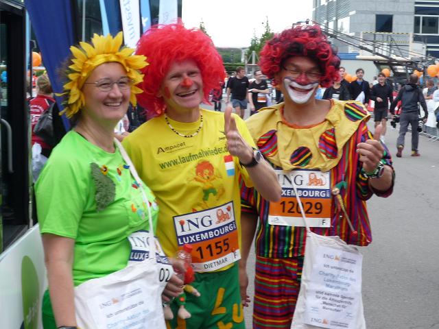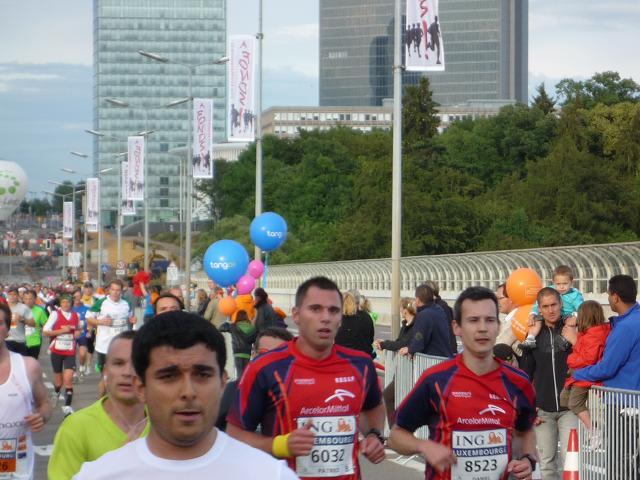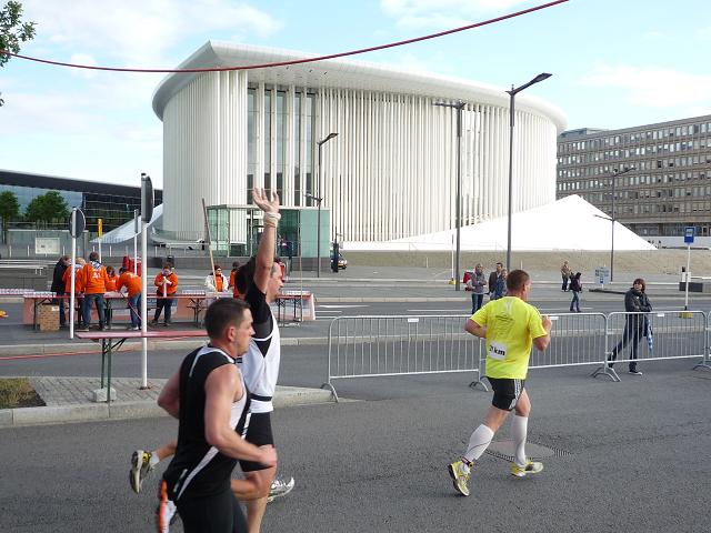 Gleich nach dem Start geht es nach einer scharfen Linkskurve aufwärts, dann aber haben wir erst einmal ein paar entspannende Kilometer vor uns, gerade recht zum Warmlaufen und zur Auflockerung des Läuferfeldes, Kilometer, die mir die Stadt von einer für mich unerwartet naturnahen Seite zeigen. Weite Wiesen und Wälder am Horizont bestimmen die ersten beiden Kilometer, die wir auf dem lang gezogenen Bogen des Boulevard Pierre Frieden am Rande Kirchbergs zurück legen. Schon hier spielen die ersten der 45 Muskgruppen, die uns an der Strecke erwarten, auf. Auch die folgenden drei Kilometer, in uns in einer Schleife über die noch jungen Allee-Boulevards Konrad Adenauer und Prince Charles - welch große Namen für solch einsame Straßen - führen, sind äußerst naturverbunden und von nur lockerer Wohnbebauung unterbrochen.