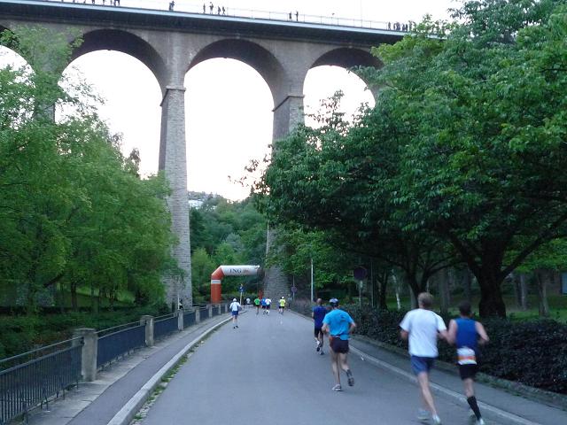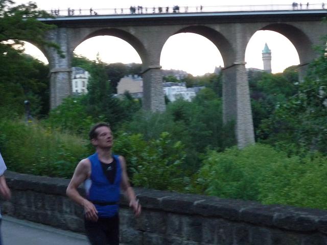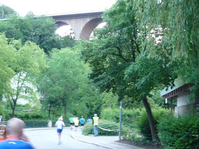 Der Petrusse im Talgrund, nun in entgegen gesetzter Richtung folgend, setzen wir unseren Ausflug durch die Luxemburger “Unterwelt” fort. Einfach wundervoll ist der Blick durch die üppige Naturszenerie im Tal und nach oben aus dem Tal heraus. Es ist kaum zu glauben: Wir sind hier mitten in der Stadt und doch so fern jeglichen städtischen Lebens. Von hoch oben, von der Place de la Constitucion, die sich wie ein überdimensionaler Balkon in das Tal schiebt, schwappt zwar die Feststimmung akustisch zu uns herab, und doch erscheint mir diese Welt so weit entfernt. Ohne Zweifel: Für mich ist dieses Teilstück eines der absoluten Highlights des Marathons. Auch wenn sich ein leicht mulmiges Gefühl bei dem Gedanken nicht verhehlen lässt, all das auch wieder empor klettern zu müssen .....