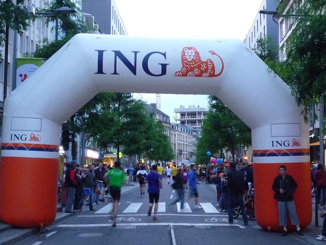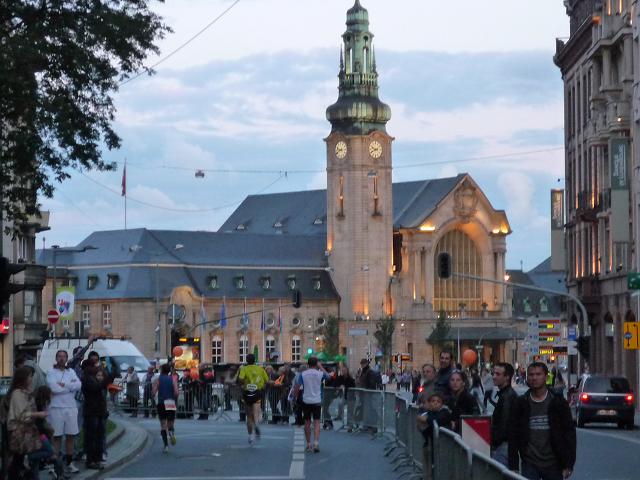 Etwa bei km 20 feiern wir ein weiteres Mal Wiedersehen mit dem Stadtpark. Allerdings nur, um uns sogleich zum nächsten Vorortausflug zu verabschieden: Merl und Hollerich sind es nun, die von den Läufern heimgesucht werden. Wobei Heimsuchung angesichts des ausgedünnten Läuferbandes etwas übertrieben erscheint und allenfalls von manchem blockierten Autofahrern so empfunden werden dürfte. Erneut werden wir im wilden Zickzack durch die Gegend gelotst. Jegliche Orientierung geht mir dabei verloren. Andererseits: Der stetige Wechel der Laufrichtung hat durchaus seinen Reiz und erscheint mir allemal spannender als endlose Geraden. Eine willkommene Abwechslung bietet der hübsche, mit kleinem See im Zentrum angelegte Parc de Merl bei km 25.