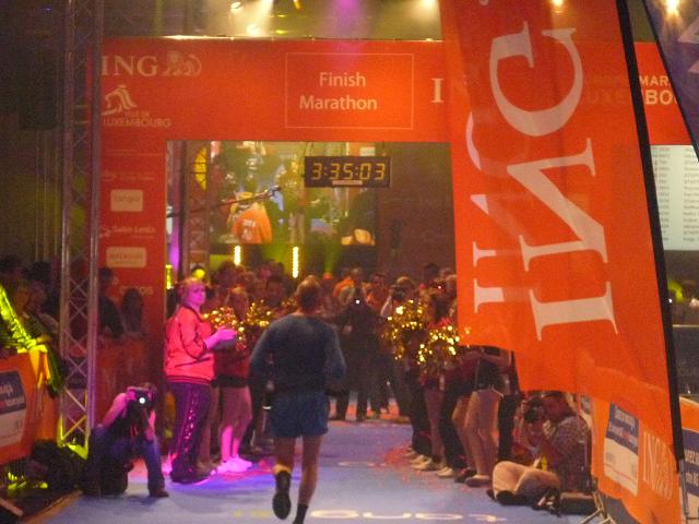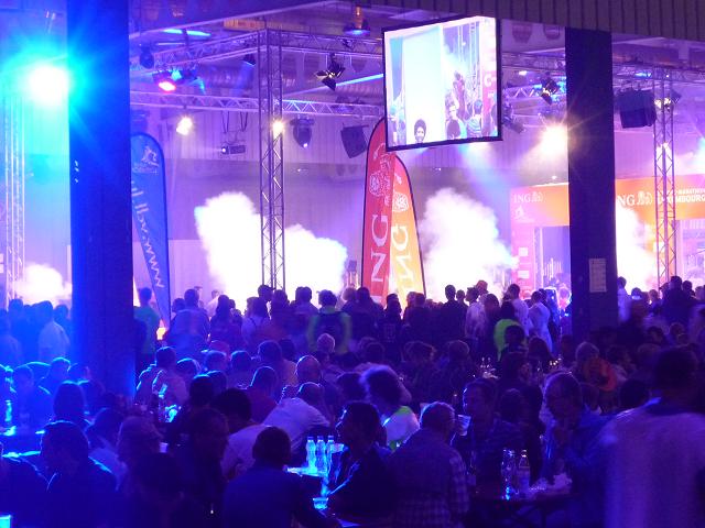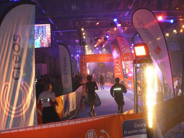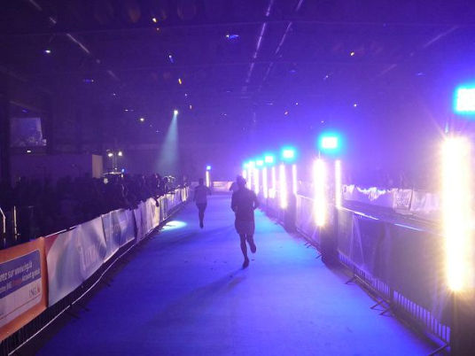 Ich passiere das Tor. Das einzige, was ich zunächst warhnehme, sind grelle Scheinwerfer am Streckenrand und ein den Raum zur Gänze füllendes tiefes Blau. Donnernder Lärm schlägt mir entgegen, eine Melange aus Geklatsche, Gejohle, Musik. Erst jetzt, in der Schlusskurve durch die Halle erkenne ich weitere Details: Bunte, rotierende Scheinwerfer, Kunstnebel, Fahnen, dicht gedrängte Menschen, wohin man schaut, ein Trupp Cheerleader vor dem Zieleinlaufbogen, eine große Leinwand mit Liveübertragung aus dem Zielbereich dahinter. Der Empfang ist begeisternd, persönlich werden die Ankömmlinge vom Zielsprecher begrüßt, wie im Rausch erreiche ich das Ziel. Wow! Was für ein Finale.