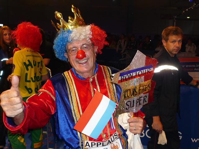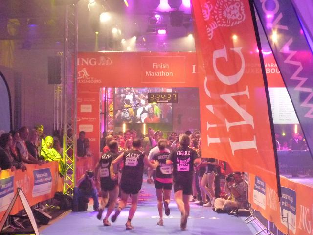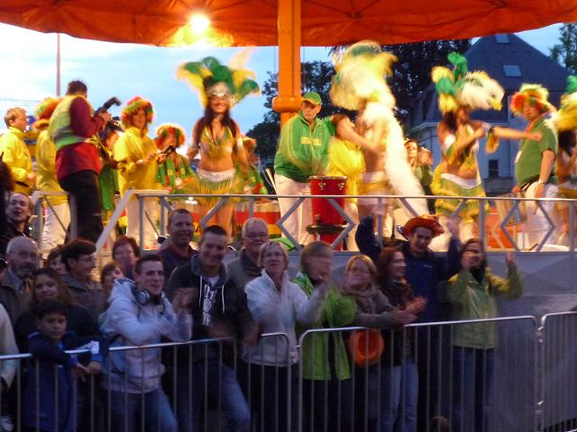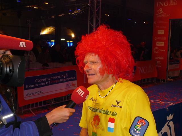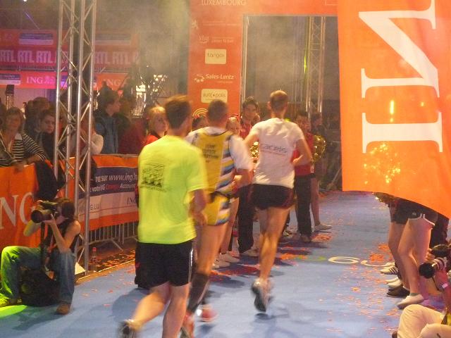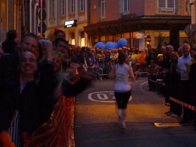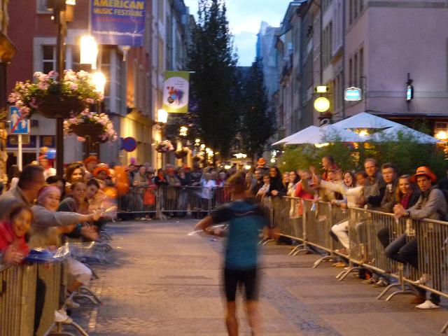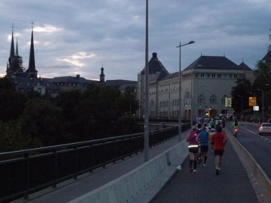 Von hier geht es für uns nun wieder direkt hinein in die winkeligen Gassen der Altstadt, diesmal auch vorbei am großherzöglichen Palais, der Stadtresidenz der großherzöglichen Familie. Und was ich hier - abermals - erleben darf, ist schwer in Worte zu fassen. Die ganze Altstadt scheint in eine einzige Party-Zone verwandelt zu sein. Ich kann kaum glauben, wie viele Menschen am Streckenrand harren, nur um jeden Läufer. persönlich anzufeuern. Diese Emotion, diese Euphorie - selten habe ich so etwas erlebt, nie flogen mir die Worte “allez Klaus” so oft in die Ohren. Auch bei mir zeigt das Wirkung. Gerne lasse ich mich davon anstecken, vergesse meine schweren Beine und lasse mich durch die Gassen tragen, mache übermütig jede Menge Fotos, obwohl sie in der Dunkelheit alle unscharf werden..Wie im Flug vergehen die Minuten, viel zu schnell. Kurz wird es am Rande der Altstadt, am Stadtpark entlang, etwas ruhiger, dann, wie ein letzter Paukenschklag, tobt die Party noch einmal am Place Robert Schumann, tanzen spärlich bekleidete Mädels einer brasilianischen Tanzgruppe hell erleuchtet auf dem offenen Oberdeck eines Busses, schallt wildes Sambagetrommel durch die Nacht und verklingt langsam im Hintergrund, als wir bei km 37 auf die “Rote Brücke” zur finalen Geraden durch Kirchberg einlaufen.