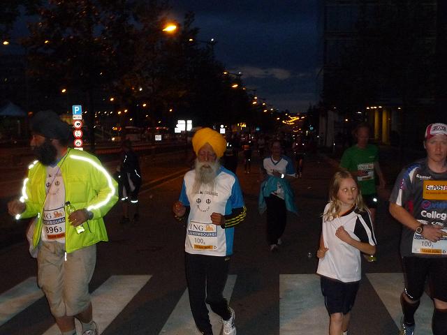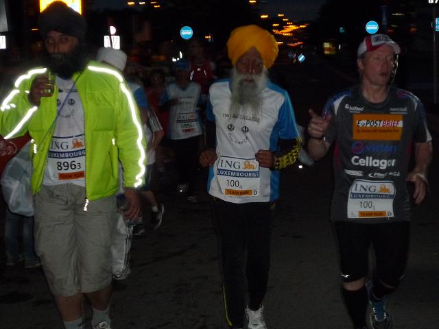 5 km liegen noch vor uns, nur 5 km, und doch habe ich selten so schwere Kilometer erlebt. Es ist Nacht, es ist einsam, auf der Straße, an der Straße - und es geht aufwärts, nicht allzu sehr, aber unerbittlich. Jenseits der Brücke fällt mir eine kleine Gruppe Läufer auf, die noch langsamer als ich dahin schleicht. Erst kurz bevor ich sie erreiche, weiß ich, wen ich vor mir habe: Es ist Fauja Singh mit seiner Entourage, darunter Joey Kelly, die mit ernster Miene und wortlos durch die Nacht ziehen. Ich überhole, blicke mich um, versuche die Miene dieses Fauja Singh zu ergründen. Aber diese verrät nichts, rein gar nichts. Schweigend trabt er in gleichmäßigen Schritten ohne jede Regung dahin. Was mag in ihm vorgehen? Ich kann es mir nicht verkneifen, ein Bild von der Gruppe zu schießen, komme mir allerdings gleichzeitig ziemlich respektlos vor.