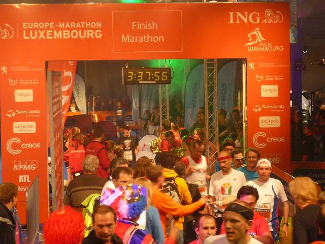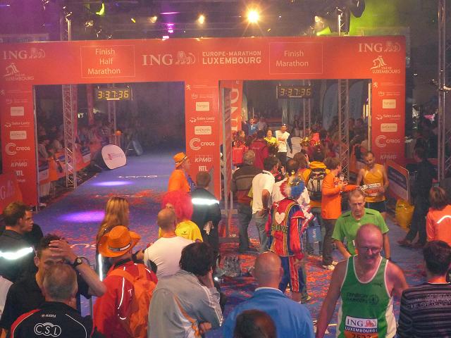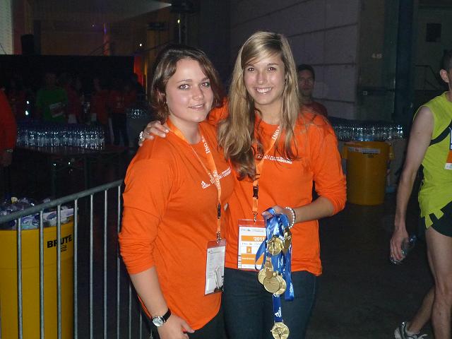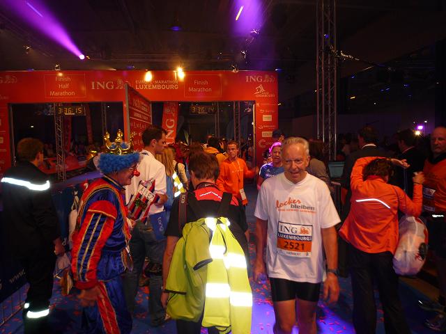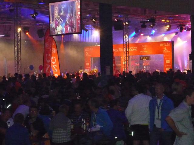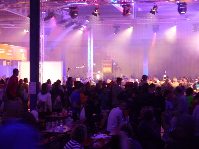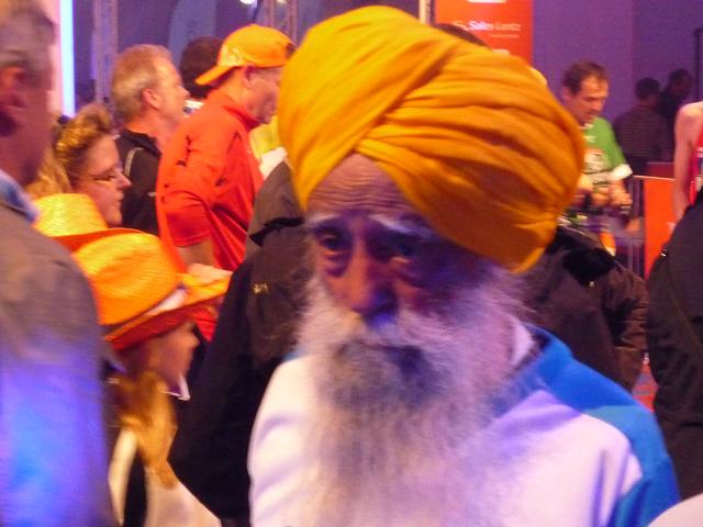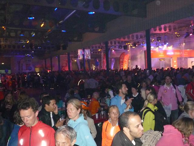 Ich komme mir vor wie in einer Riesen-Disko. Es wird gefeiert. getrunken, gegessen. Es ist 22:30 Uhr und die Halle ist knallvoll. Die efolgreichen Ankömmlinge mischen sich unter die Zuschauer. Dann auf einmal Riesenjubel: Fauja Singh “Superstar” erreicht das Ziel. Ein Konfettiregen ergießt sich über ihn, Blitzlichtgewitter schlägt ihm entgegen. Ich glaube, dem armen Mann ist das alles ein bisschen zu viel. Zumindest entschwindet er schon bald in einem Nebenausgang.