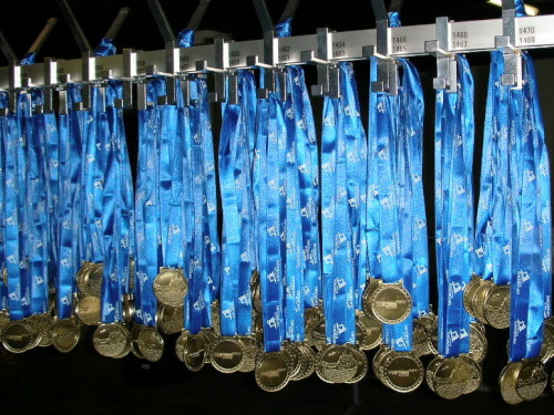 Richtig geil sind die letzten hundert Meter, die in die Halle führen. Hier fühlt sich jeder, der es geschafft hat, als Sieger. Die Atmosphäre, aus der Dunkelheit auf Teppichboden in eine gut besetzte und beleuchtete Halle einzulaufen, ist schon etwas ganz Besonderes. Und so geht es mir wie Bernhard: mit einem Jauchzer und einem kleinen Luftsprung wird die Ziellinie überquert. Ich koste ausgiebig die Stimmung im Zielbereich, bevor wir uns in Richtung Verpflegungsbereich aufmachen. Die Medaillenausgabe finden wir noch, doch die Verpflegung nicht mehr.