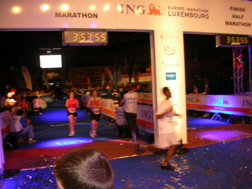 Wie schon erwähnt, führt km 38 stramm nach oben. Der Hammer aber ist, daß man bei km 39 nur 200 m am Ziel vorbeiläuft und noch eine Zusatzrunde um die Coque absolvieren muß. Darauf sollte man wirklich vorbereitet sein, denn wer hier körperlich am Ende ist, bekommt mental noch einen mit. Ich aber lache darüber (nee, nicht wirklich!) und beiße mich weiter voran. Der 40. Km führt wieder leicht hoch, aber bei km 41 ist es geschafft: Jetzt geht’s nur noch abwärts und wer kann, läßt es rollen. Ganz toll schon die letzten drei-/vierhundert Meter außerhalb der Halle: Hier liegen beiderseits der Straße viele hundert Mega-Teelichter, die die mittlerweile hereingebrochene Dunkelheit verzaubern.