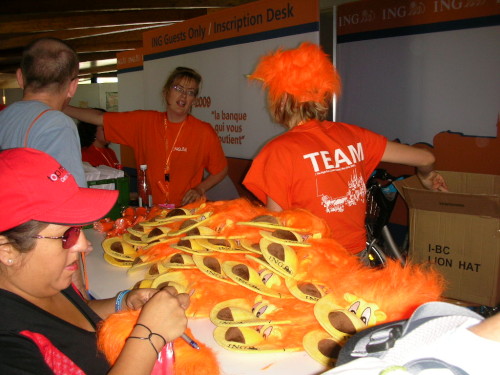 Wir gönnen uns eine Übernachtung im Flughafenhotel und sind hoch erfreut über ein nettes Präsent, einen kleinen mit „Good Luck“ beschrifteten Karton, der ein Elektrolytgetränk, eine Banane und zwei Riegel enthält. Nach dem Einchecken fahren wir direkt zu unserer abendlichen Wirkungsstätte. Da wir vorgewarnt sind, nicht die unmittelbar an Start und Ziel gelegenen Parkplätze anzufahren (hier kommt man wegen der Straßensperrungen nicht vor 0 Uhr wieder weg), fahren wir vom Hotel nur eine Autobahnausfahrt weiter (No. 8), parken an der Messe und nutzen den kostenlosen Shuttlebus. Eine weise Entscheidung, denn in der „heißen“ Zeit fährt der alle fünf Minuten, auch abends/nachts.