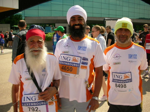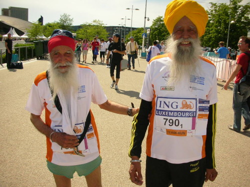 Messe, Start, Ziel und das ganze Drumherum findet in der sog. Coque statt, eine muschelförmige Halle (erinnert ein wenig an die Berliner „schwangere Auster“), das Centre National Sportif & Culturel. Kann man denn nirgends ungestört seiner Lieblingsbeschäftigung nachgehen? „Aha, der Wolfgang von marathon4you.de“ begrüßen uns mal wieder Birgit Hagelauer und Bernhard Sesterheim, die nur schlappe vierzig km Anfahrt haben. Vor der Halle bekomme ich noch den 98jährigen (in Worten: achtundneunzig) Inder Fauja Singh vor die Linse, der sich am Teammarathon beteiligen wird. Achtundneunzig. Das heißt Geburtsjahr 1911. Da hatte Kaiser Willi II. noch sieben Jahre vor sich. Unvorstellbar...