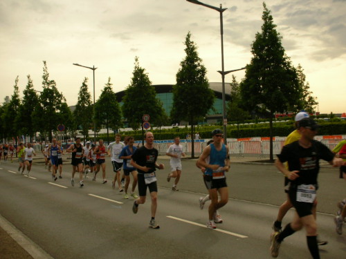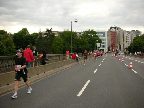 Halbzeit ist bei 1:55 Std., au Backe, ist das zu schnell? Ich fühle mich aber gut und beschließe, das Tempo beizubehalten. Was nicht immer ganz einfach ist, denn der Kurs ist für einen Stadtmarathon recht hügelig; ich denke, so an die 200 Höhenmeter werden insgesamt schon zusammengekommen sein. Gepaart mit dem winkligen Verlauf ist das sicher kein Kurs zum Rekorde laufen. Auch die Sieger werden heute deutlich unterhalb der bisherigen Bestzeiten bleiben.