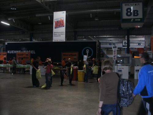 In der Halle sind auch Umkleiden und Duschen sowie die Kleiderbeutelabgabe. Hierfür benutzt man praktischerweise den Starterbeutel, der dazu mit der Startnummer beschriftet wird. Eine Halle weiter wird uns nach dem Zieleinlauf die Zielverpflegung erwarten.
