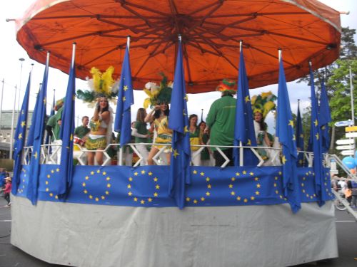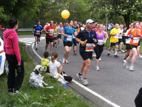 Jetzt geht es eine längere Strecke geradeaus vom Kirchberg über eine lange und hohe Brücke zum ersten Zuschauerpunkt. Es macht schon richtig Spaß hier zu laufen. Hier gibt es viele Zuschauer und wir werden begeistert angefeuert. Nach 8,5 Km ist der erste Wechselpunkt für die Teams erreicht. Eine Augenweide sind die hübschen Tänzerinnen.