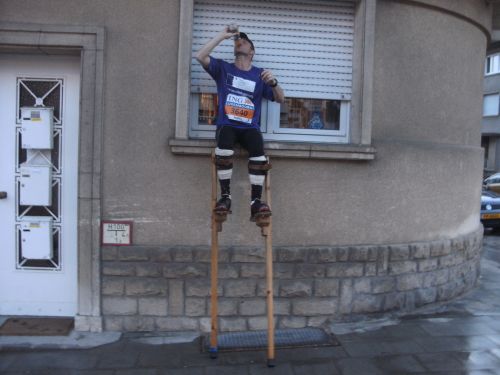 Schon früh war ich von einem Läufer auf Stelzen überholt worden. Später nutze ich eine Pause von ihm aus, als er auf einer Fensterbank in 2m Höhe eine Pause macht, und überholte ihn meinerseits. Nun spüre ich wieder seine raschen Stelzenschritte im Nacken. Hilfe erfahre ich von einigen Metern Kopfsteinpflaster. Das bereitet ihm Probleme und verschafft mir eine Atempause, bevor er wieder unaufhaltsam von hinten kommt und vorbei stürmt.