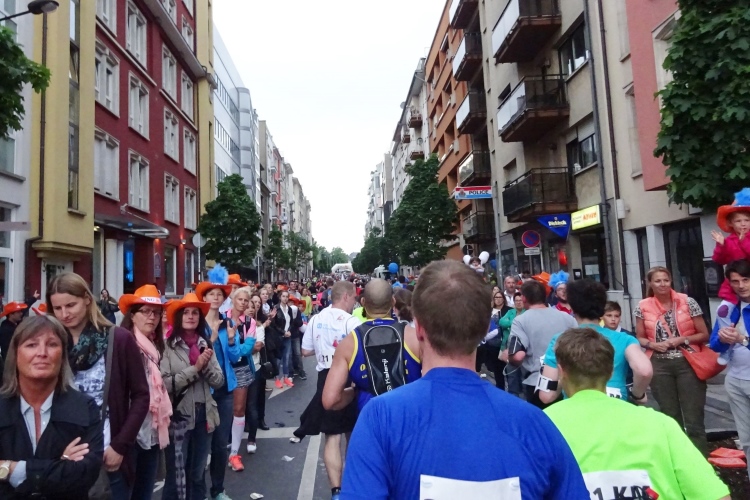 Die Strecke verläuft stetig nach Westen, dort wo die Sonne einen roten Abendhimmel erzeugt. Im Osten ist die Nacht angebrochen, der Himmel ist schwarz. Bei Kilometer 17 holt mich Petra wieder ein. Sie hat ihr Tempo etwas reduziert und dürfte mit ca. 2:17 die 21,1 km erreichen. Ich bleibe aber an beiden dran und versuche kontrolliert zu laufen. Auf der anderen Straßenseite kommen uns die vor uns liegenden Einzel- und vor allem vielen Staffelläufer entgegen. Die Sambagruppe „Piranhas op jück“ begrüßt die Vorhut. Die Schleife ist kurz, eine Labestelle lädt zum Verweilen ein. Die Wohngegend hier vermittelt hohe Werthaltigkeit. Ein Pärchen der Ärzte ohne Grenzen eilt an mir vorbei, mal sehen, wie es ihnen nach 30 km gehen wird.