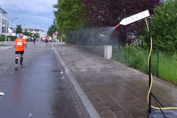 Beim Champ du Glacis ist die nächste Labestation aufgebaut. Je mehr es solche Stützpunkte gibt, desto eher bleibt man stehen und verliert wieder eine halbe Minute. Und je länger das Rennen dauert, desto schwerer wird es, auch nur 30 Sekunden wieder aufzuholen. Ich verzichte dennoch nicht auf meinen Drink – auch wenn die liebe Petra dies nutzt, um wieder am M4Y-Laufbeobachter vorbeizukommen.