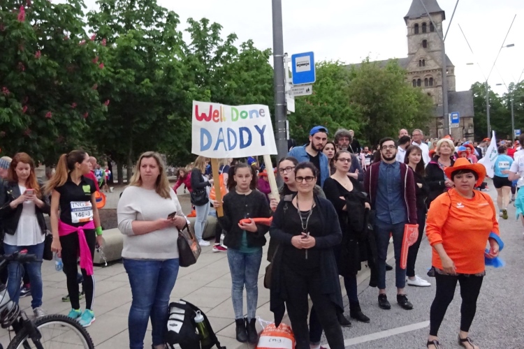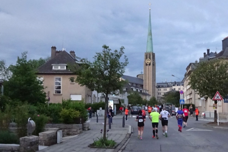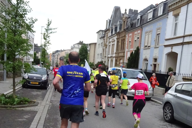 Am Ende der Brücke erwarten uns Hunderte Zuschauer, da ist was los – wie laut wird es erst in der Altstadt werden, wenn uns Tausende anfeuern? Der Kurs führt uns nun in den Stadtteil Limpertsberg. Bei der Labe bleibe ich stehen und mische mir einen Drink – in der Reihenfolge Wasser, Iso, Cola. Petra, die 4:44-Zugläuferin, kann ich nicht abschütteln, sie hält an ihrer Taktik fest: Lieber am Anfang ein wenig schneller laufen, um für den Schluss des Marathons ein kleines Zeitpolster zu haben. Jetzt um 20 Uhr ist der Abend noch nicht angebrochen, es wird noch 1 ½ Stunden hell sein. Gut für die Fotos, denke ich mir. Vor dem Place A. Laurent befindet sich die erste Staffelwechselstelle, Hunderte warten schon ungeduldig auf ihre hinter uns nachkommenden Teammitglieder.