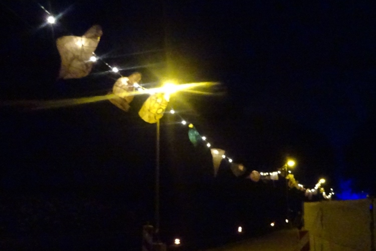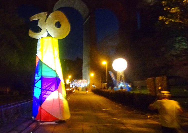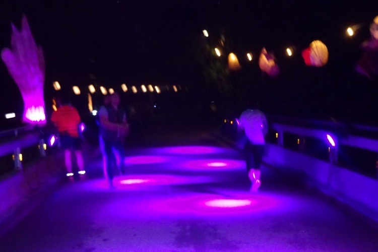 Schade, dass meine Kamera nur mehr eingeschränkt funktioniert, denn ich würde gerne ein paar Eindrücke vom den vielen Lampions und der Partystimmung in den Lokalen hier an der tiefsten Stelle des Marathons direkt unter den Rundbögen der Brücke festhalten. An der Spitze einer 3 Meter hohen Lichtsäule ist die Zahl 30 hell erleuchtet. Nach einem Kilometer an den kleinen Bächlein Petrusse entlang geht es nun wieder 40 Höhenmeter aufwärts.
