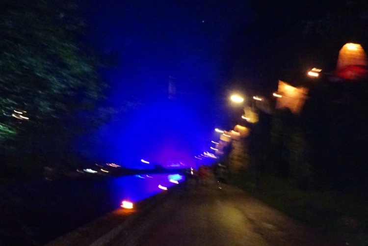 Bei der 34 km-Anzeige geht es über die Viaduktbrücke in die Altstadt. Die Sehenswürdigkeiten dort inklusive der Kasematten habe ich schon am Vormittag tlw. gesichtet und Fotos geschossen. Doch heute erstrahlt die Nacht in der zur Partymeile umfunktionierten Innenstadt von Luxemburg zum Tag. Viele Menschen haben sich entlang der Marathonstrecke postiert. Sie sind nicht nur wegen des Marathons hier. Die Leute feiern, essen und trinken, genießen das Leben.