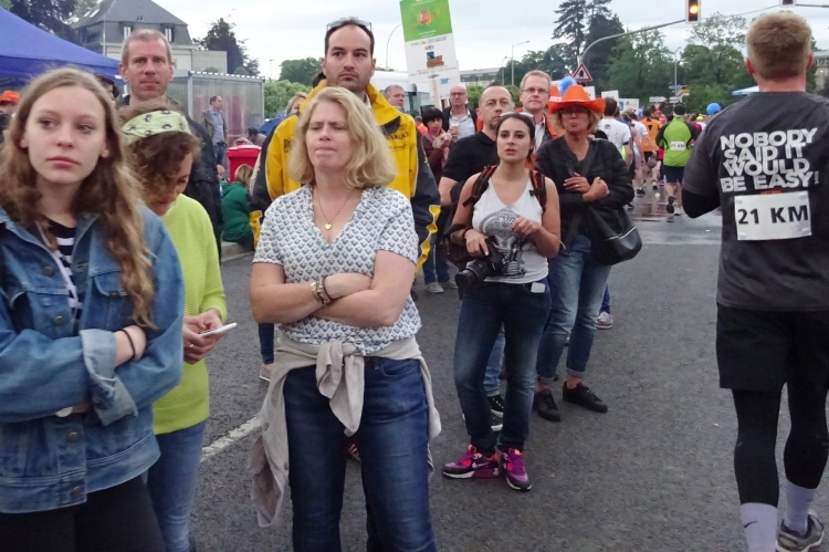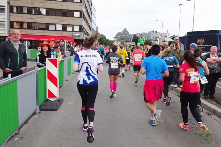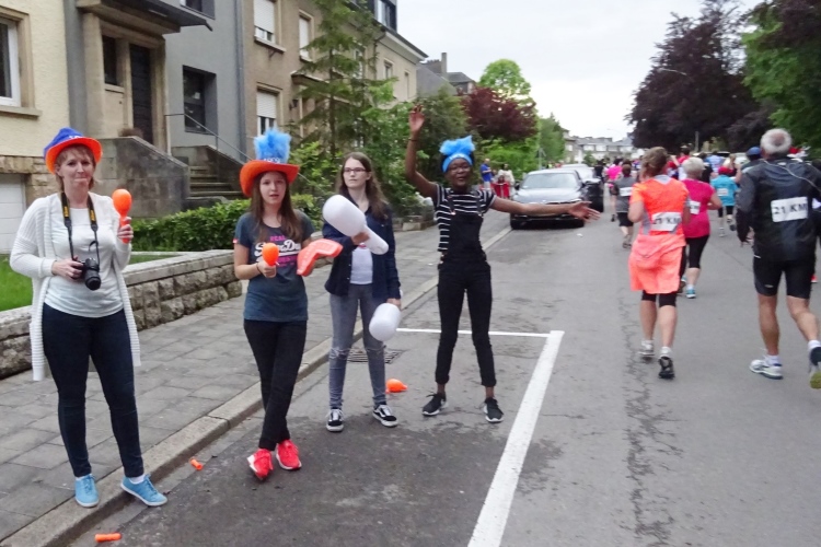 Nach rund 1 ½ Stunden Laufzeit bei Kilometer 14 verläuft der Marathonkurs nun in das Innere der Altstadt. Um den Place Guillaume II stehen wieder viele Zuschauer mit den orangen Hüten am Kopf. Man identifiziert sich mit dem großen Sportereignis. Die Absperrungen sind mitunter nur drei Meter breit, sodass man mit den begeisterten Menschen abklatschen kann. Inzwischen schon das dritte Mal assoziiert man meinen Namen auf der Startnummer mit dem „Anton aus Tirol“ – und fängt zum Singen an. Eine Musikgruppe spielt. Ich konzentriere mich auf die Kinder, manche strecken mir den kleinen Finger einer verlängerten Hand aus Schaumgummi entgegen. Ein Bub mit listigen Augen zieht seine Hand schnell zurück, sodass ich ins Leere schlage. Die Halbmarathonis biegen nun ab. Für sie geht es auf den letzten sechs Kilometern auf einen tlw. anderen Kurs wieder zur Lux-Expo zurück.