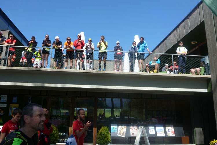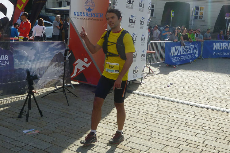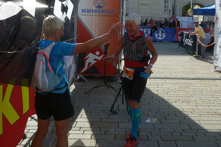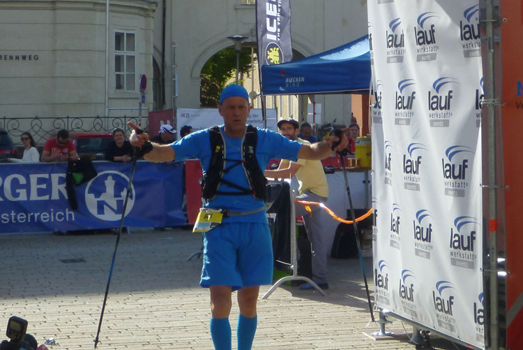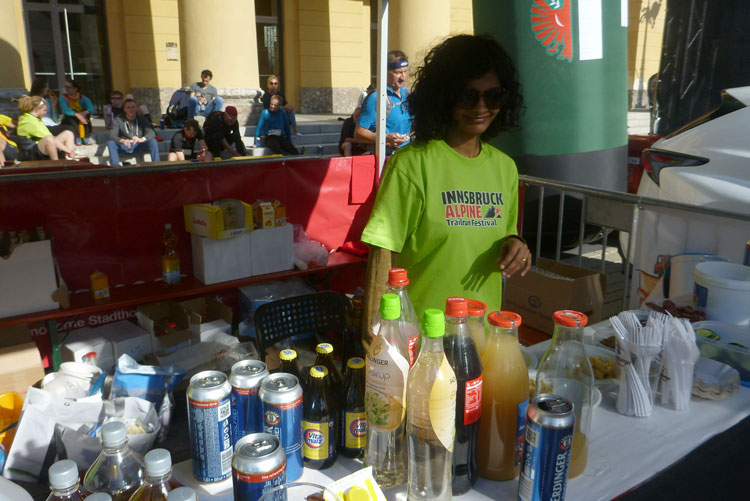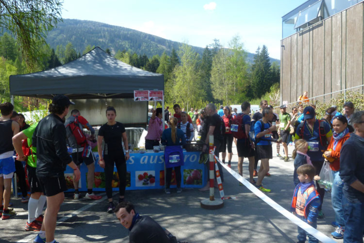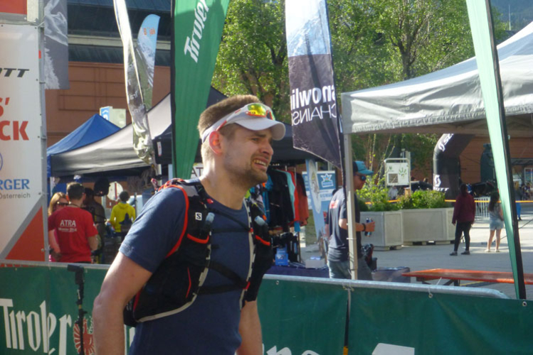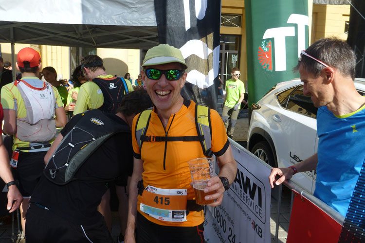 Ich habe mir mein Rennen optimal eingeteilt, mein Zeitplan und auch meinen Zeitenziel sind locker aufgegangen und so komme ich heute ungewöhnlich entspannt ins Ziel. Bunt gemischt treffen nach und nach die Finisher des K42, K65 und K85 im Ziel ein. Vor dem Verpflegungsstand in der Sonne kann man es gut aushalten. Delikate Tiroler Schmankerl, wie Ziegenkäse und Salami sind bereit gestellt. Dazu kommt noch das beliebte bayrische Alkoholfreie. Zwei Becher davon gehen nach dem langen Tag runter wie Öl.