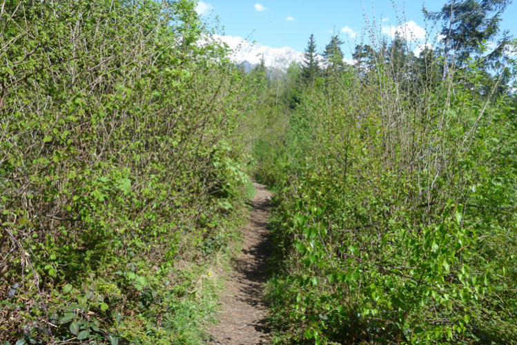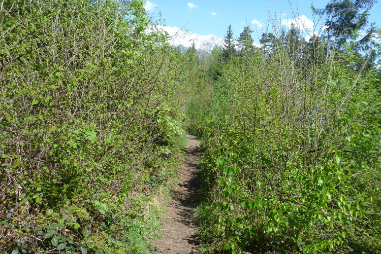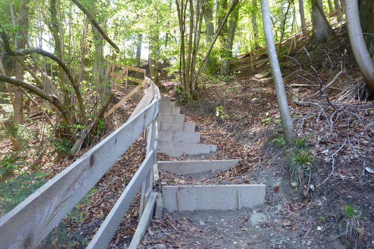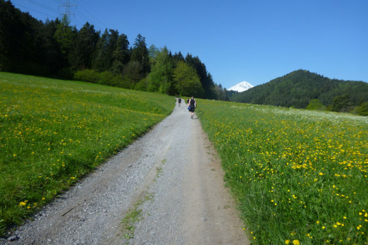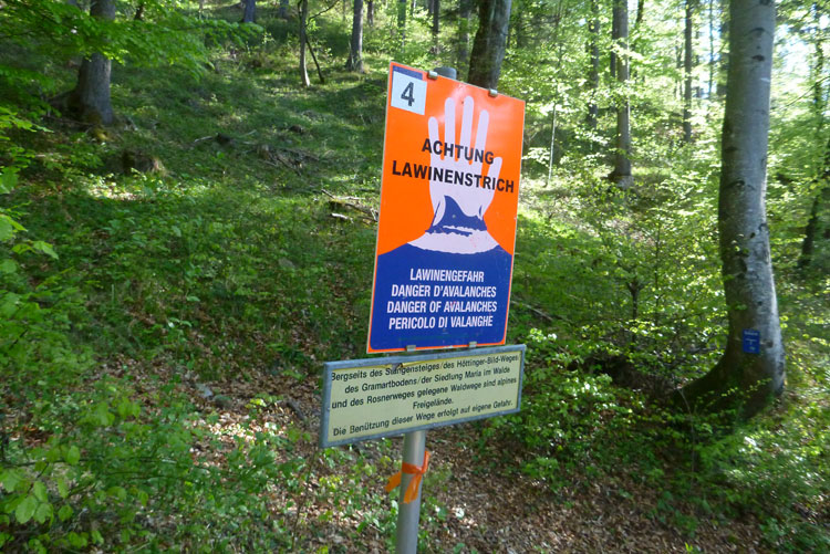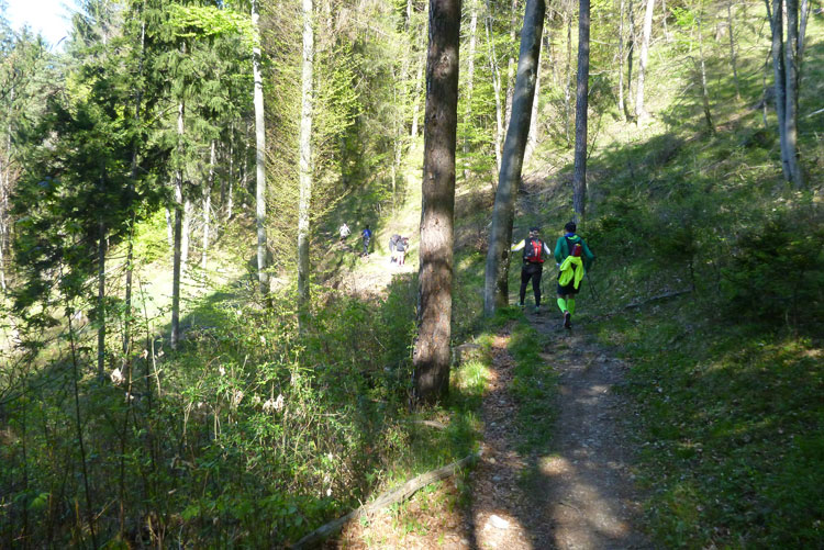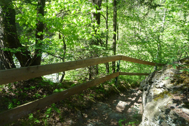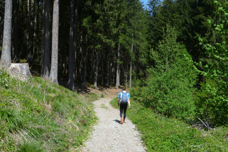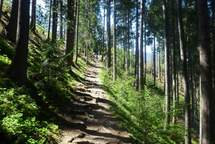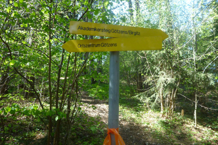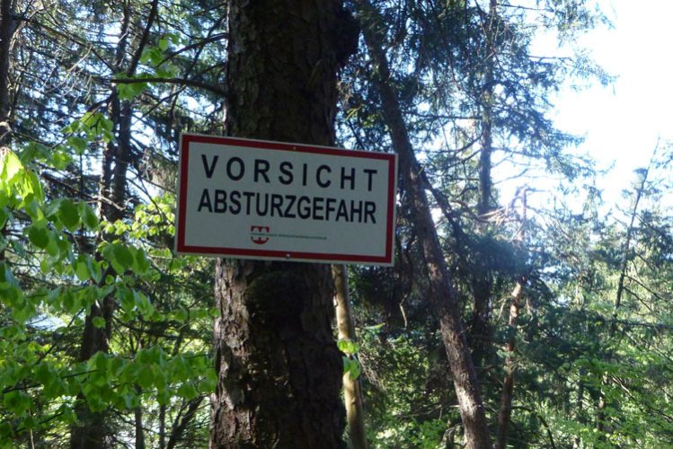 Dann wird es wieder rustikaler. Direkt nach Ortsende geht es auf den Akademikersteig. Über 1,5 km führt der äußerst wurzelige Steig an einem Hang durch den Wald. Auch wenn uns das Schild „Begehen des Steigs auf eigene Gefahr“ einen riskanten Weg einreden will, viel mehr als über Wurzeln zu stolpern kann man hier nicht.