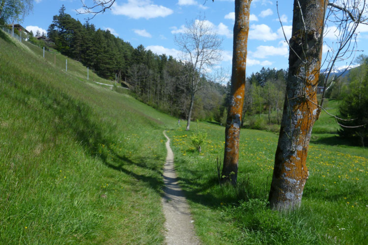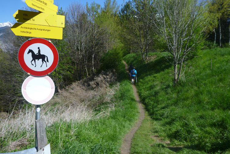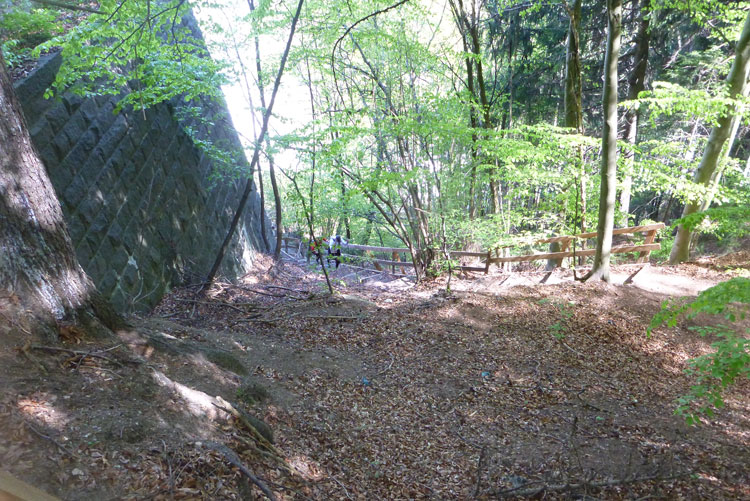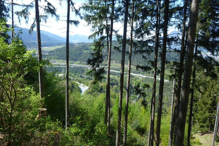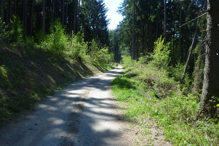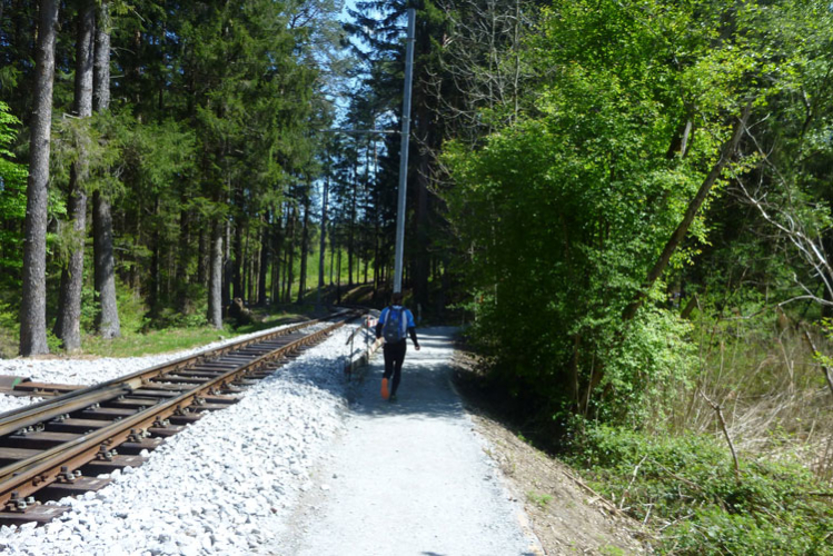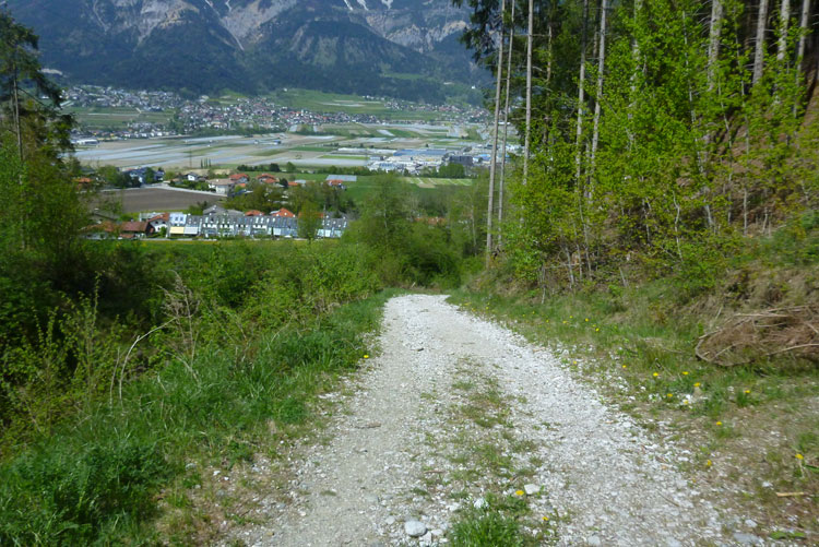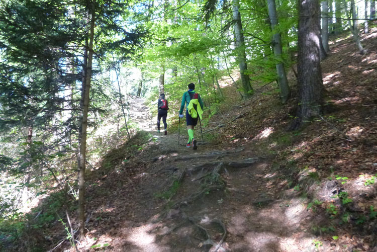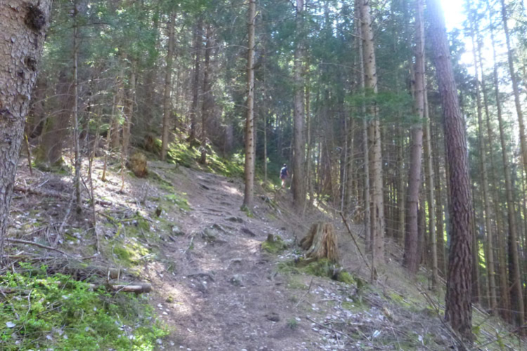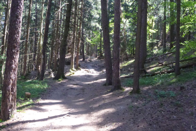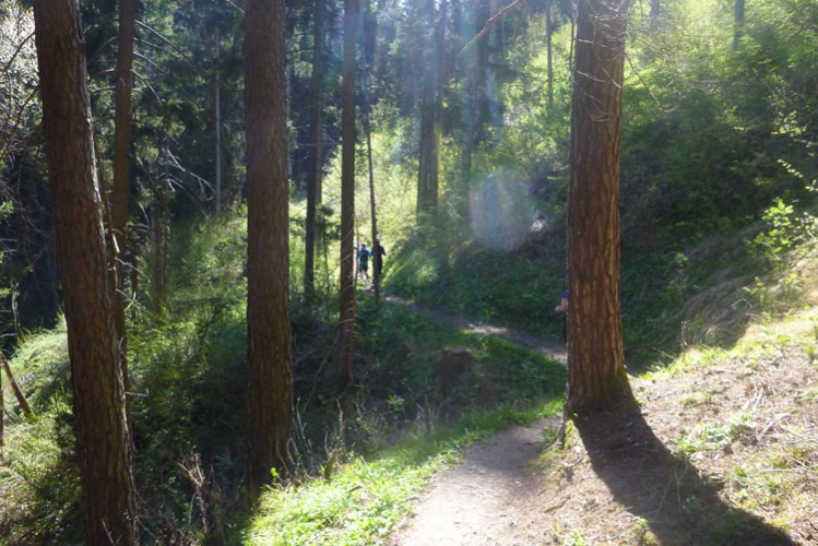 Es geht hinauf Richtung Lanser Kopf. Der dritte Auf- und Abstieg bietet wieder viel Abwechslung und ein breites Spektrum an ständig wechselnden Untergründen. Wurzeltrails, Waldwege, Forststraßen, Teerabschnitte und sogar ein Stück am Bahndamm entlang.