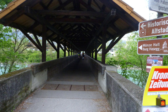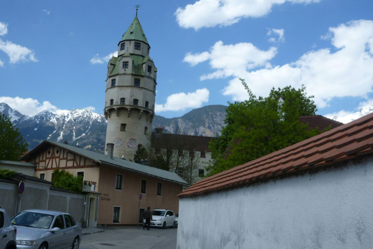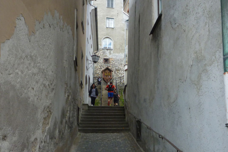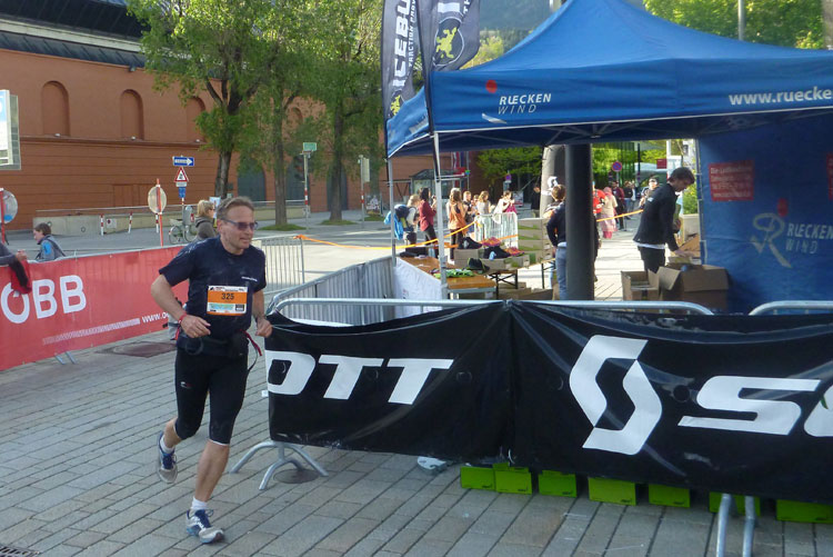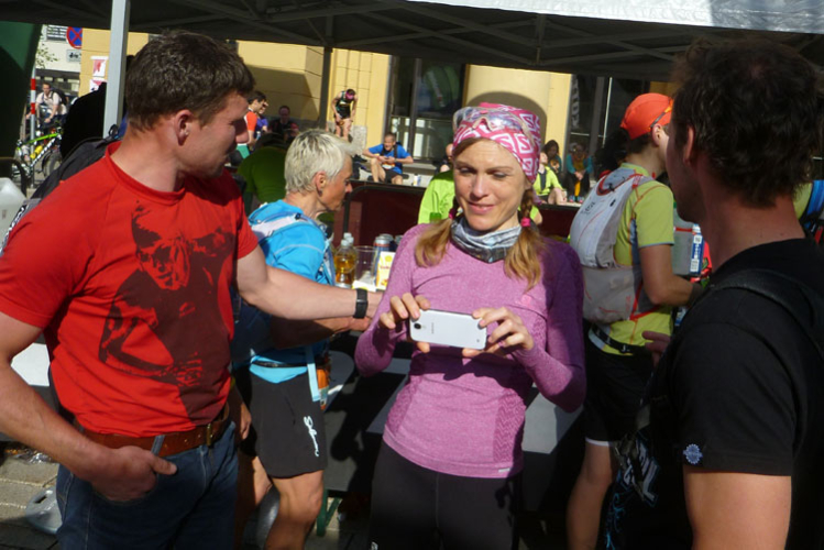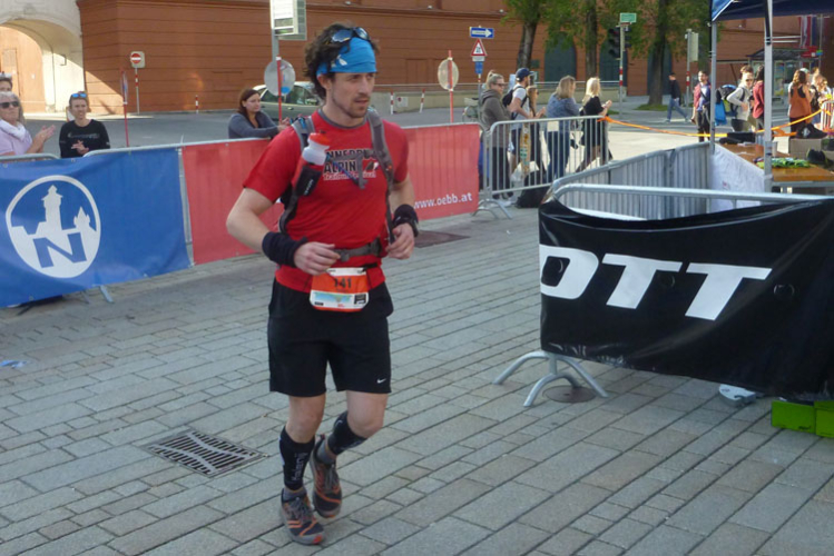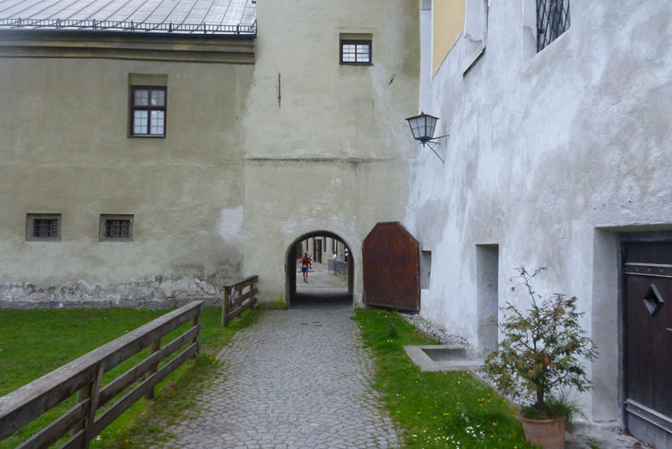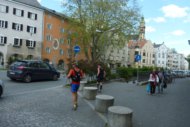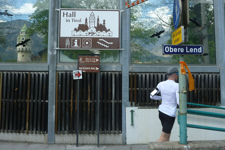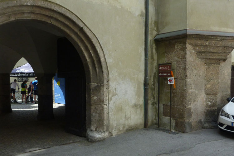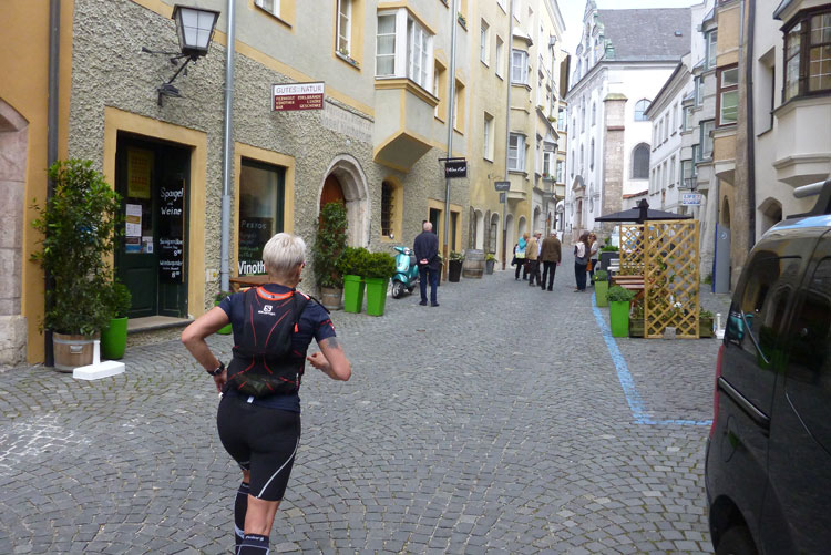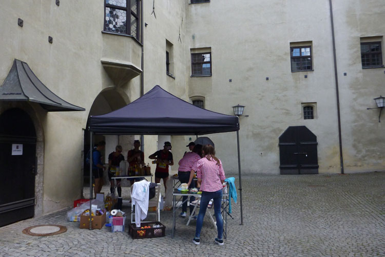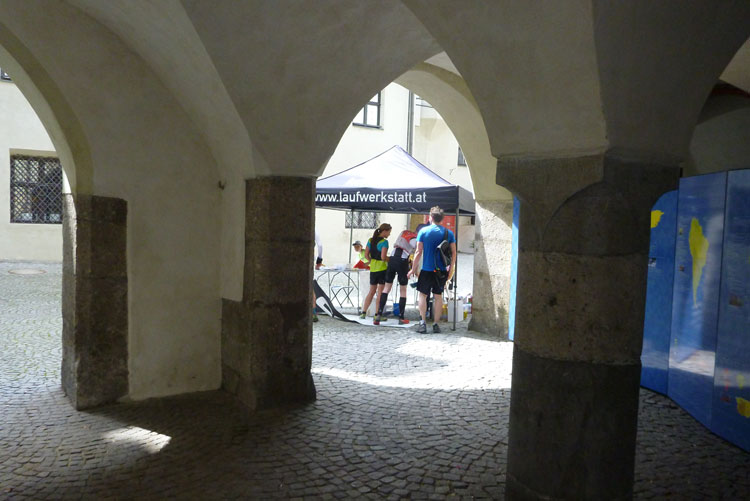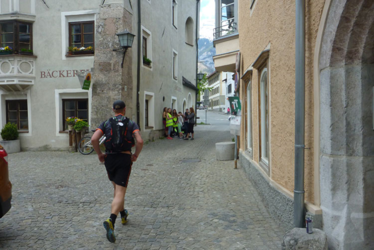 Nach 48 km erreichen wir Hall in Tirol. Mit seinen mittelalterlichen Gebäuden zählt der Ort zu den schönsten Städten Österreichs. Durch die Salzgewinnung und der landesfürstlichen Münzstädte war Hall früher ein bedeutender Wirtschaftsplatz. Eine überdachte Brücke über den Inn führt uns in die Altstadt. Wir laufen direkt auf das Haller Wahrzeichen, den Münzerturm zu, wo im Innenhof von Burg Hasegg eine Versorgungsstation aufgebaut ist. Ich bin ziemlich ausgedürstet, es ist warm und mein Wasser ist schon seit einiger Zeit aufgebraucht. Auch hier gibt’s am Angebot nix zu meckern. Ach ja, das Zeitlimit: Vergesst es, 9 Stunden für 48 km beim K65 sind nicht wirklich ein Problem.