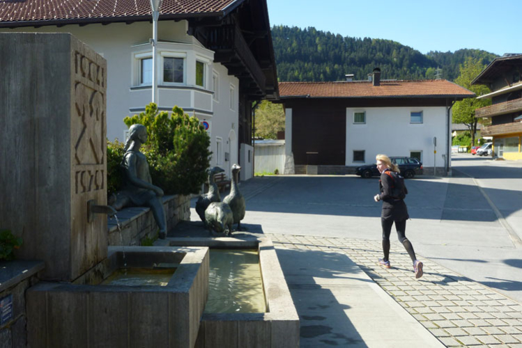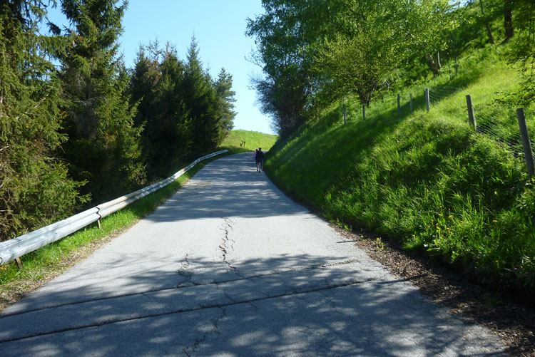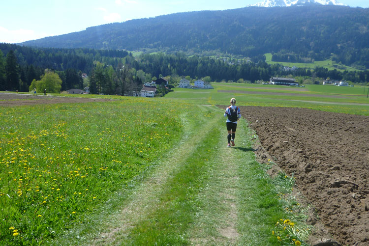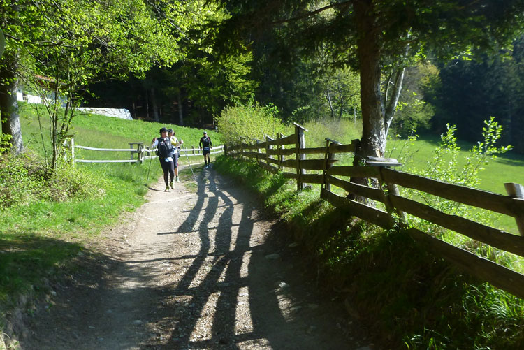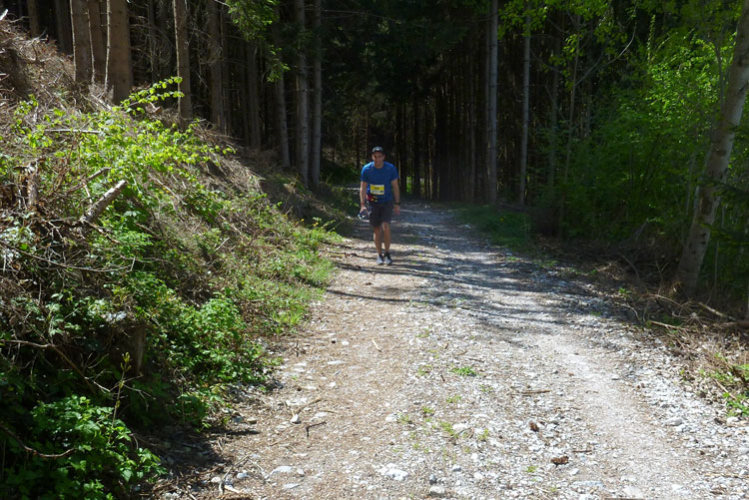Vollkommen anders präsentiert sich der zweite Aufstieg. Nach dem Ortsdurchlauf von Völs führt die Strecke meist auf Forstwegen und Asphaltstraßen mit mäßiger Steigung hoch über den Velleberg nach Birgitz wo mitten im Ort die nächste Labestelle (km 18,5) auf uns wartet.